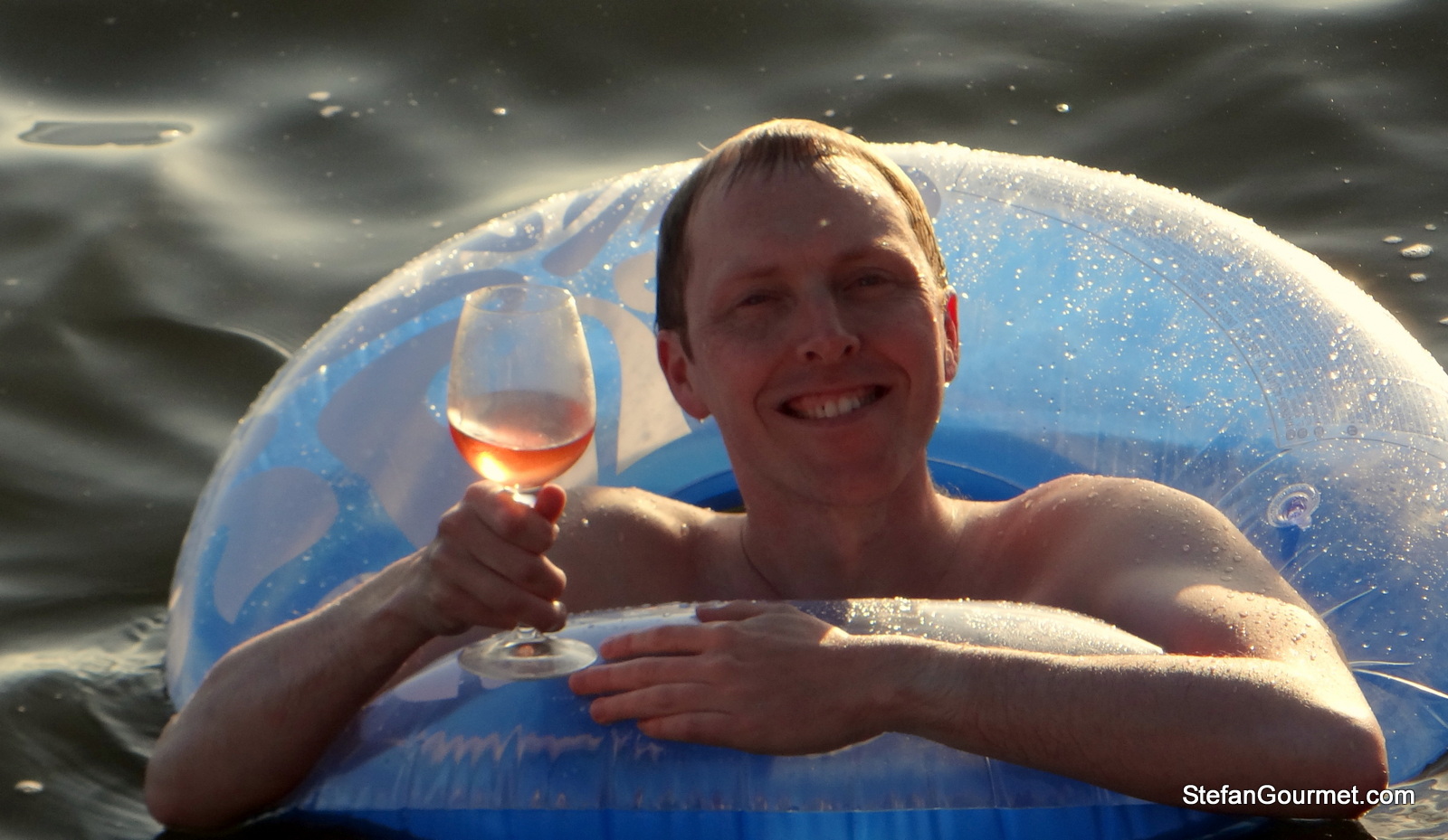 Large quantities of beer are consumed on board, but I brought my own stash of wine — a different bottle for each day, paired with the food obviously 😉 — and like to cool off in one of the lakes with a nice glass of white wine.