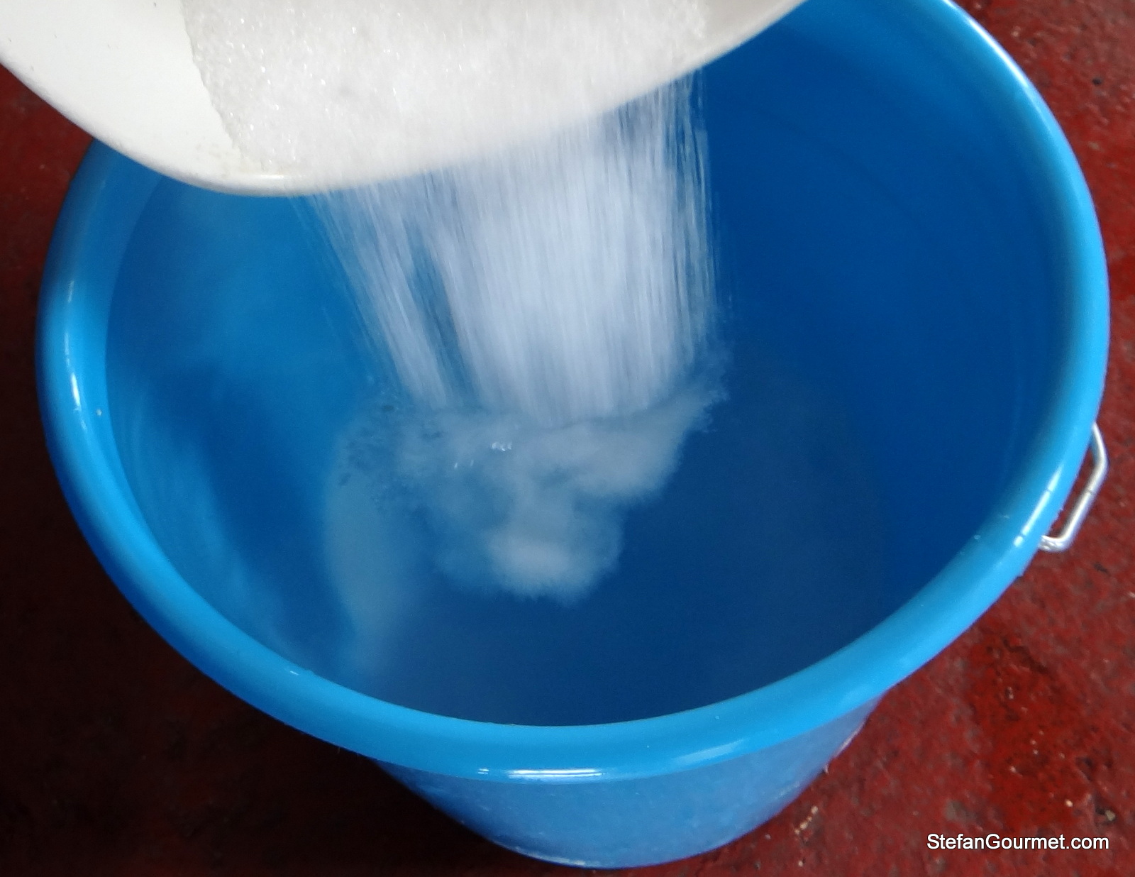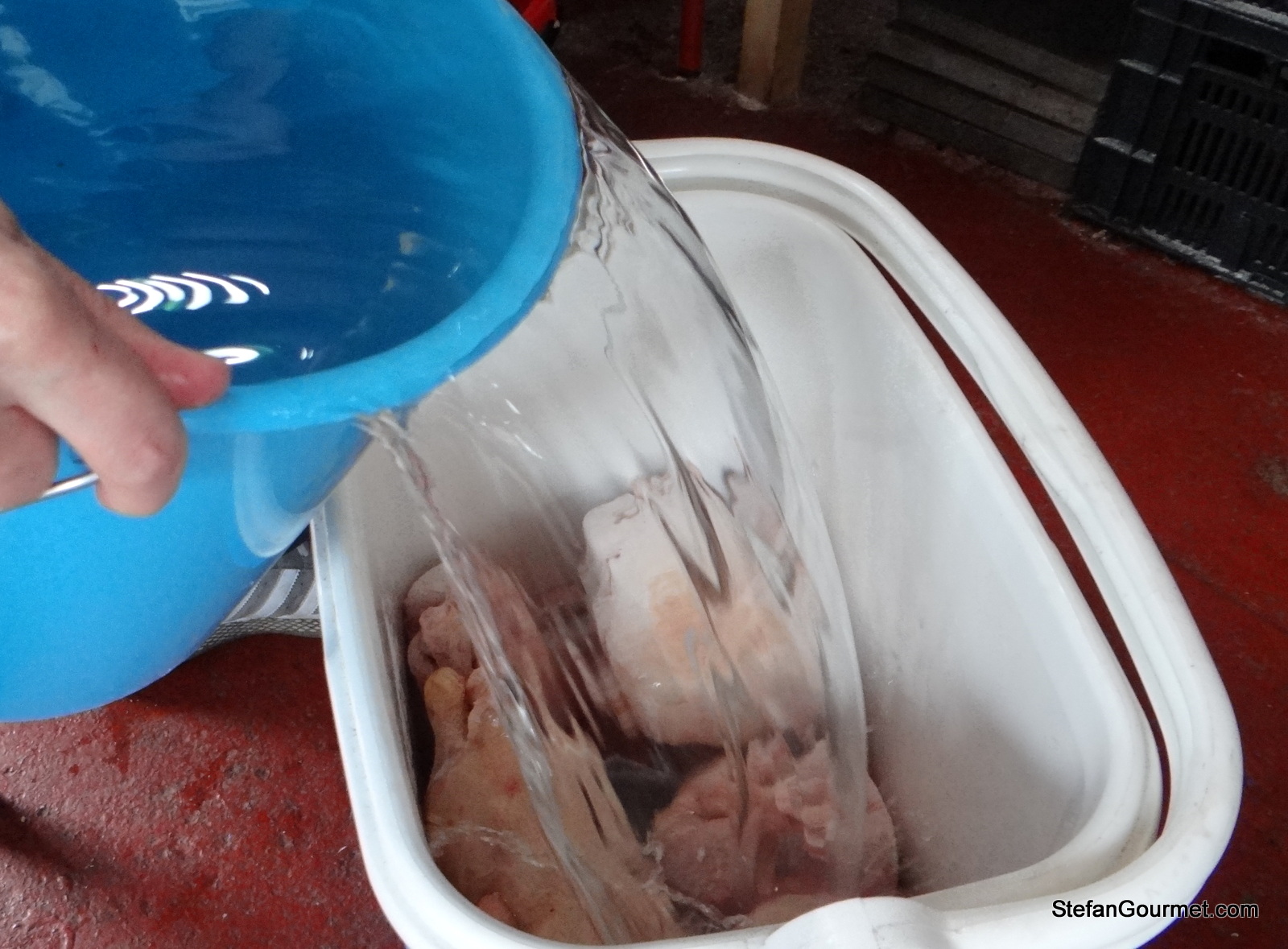 For the rotisserie chicken I prepared the same basic brine as for the spit roasted suckling pig. For 13 chickens of 1.2 kilograms each I used 18 litres of water. The total weight of water and chicken is therefore 13 * 1.2 + 18 = 33.6 kg. To obtain a 1% salt concentration, I added 336 grams of salt to the water. I also added 134 grams (0.4%) of sugar.