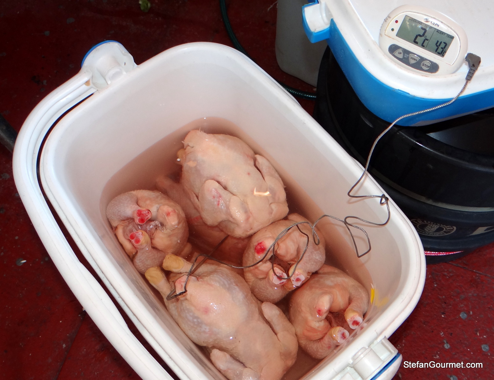 I closed the beer cooler, allowing the chickens to thaw and brine at the same time. I monitored the temperature, which should not become higher than 5C/40F. After 24 hours the chickens were thawed and brined.