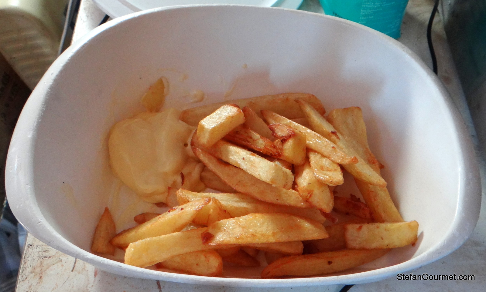 To go with the chicken, we prepared hand-cut fries, deep fried in beef tallow. As fans of Pulp Fiction know, we eat our fries with mayo.