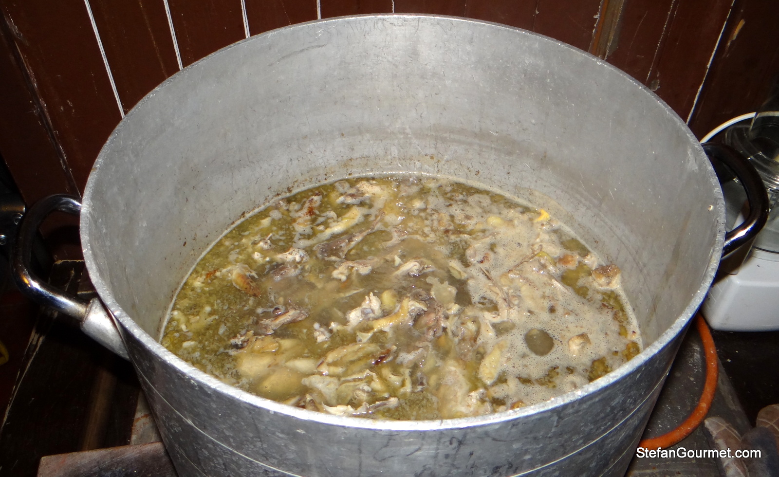 Another post from my cooking on a boat adventure. Paella is a great dish to cook for a large group, and I had borrowed a wonderful paella pan with dedicated burner. But what about stock? The stock is an important aspect of paella, which should be made from scratch rather than using bouillon cubes. Chicken stock and fish stock are obvious choices for paella, but where to get sufficient chicken or fish bones when on a boat trip?