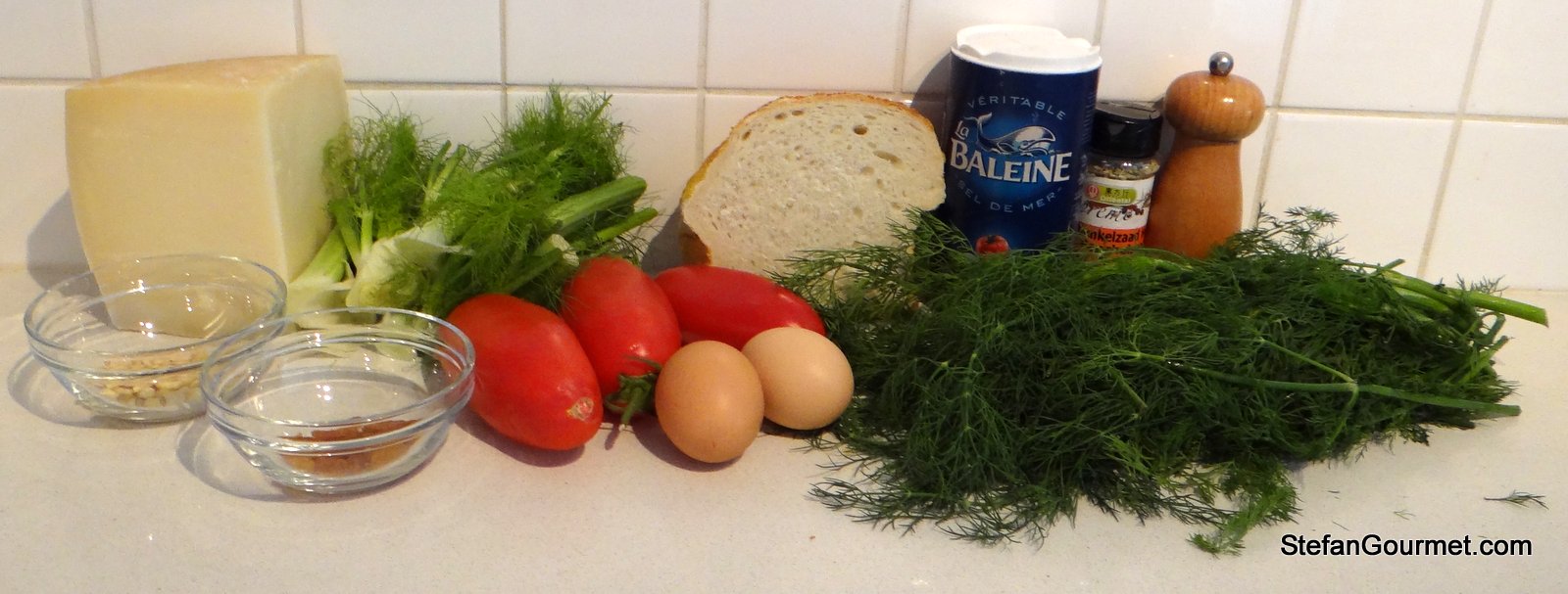 As an appetizer for my Sicilian dinner I prepared vegetarian meatballs made from fennel and dill, served with a tomato sauce. In Italy these polpette di finocchietto are made with wild fennel greens, which grow abundantly in Italy in spring. For lack of the wild fennel greens, I decided to use a mixture of fennel fronds (the green stuff on top of fennel bulbs) and dill. We loved the polpette di finocchietto during our wonderful dinner at Tischi Toschi, the best trattoria of Sicily in the port town of Messina. I did not ask for the recipe, so this is my own version. They came out great with a lot of flavor. If you’d like to cook vegetarian, this is also very suitable as a main course.