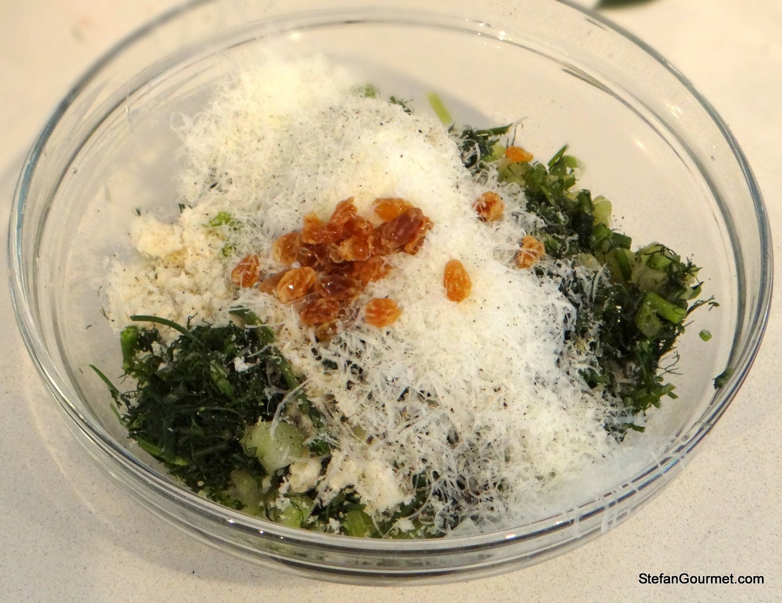Add parboiled fennel and dill, raisins, pine kernels, breadcrumbs,  cheese, salt, and freshly ground black pepper.