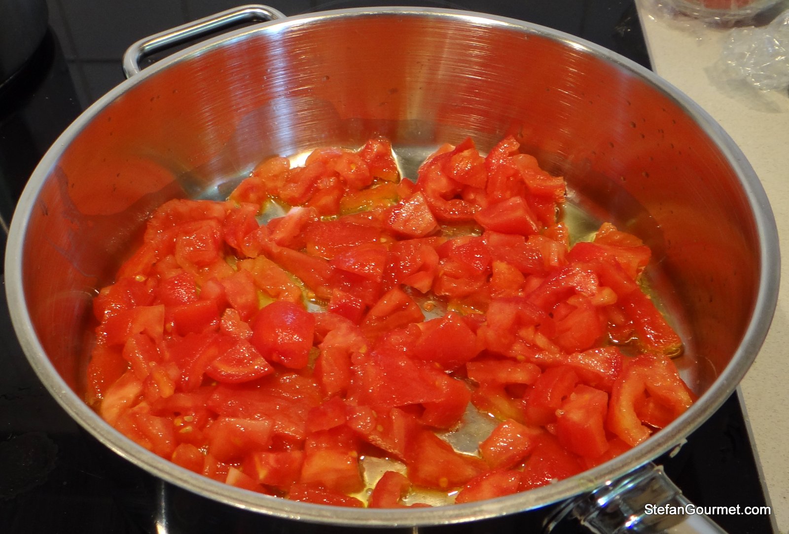 500 grams (1.1 lbs) plum tomatoes, peeled, seeded, and chopped (or 400 grams/14 oz canned tomatoes)