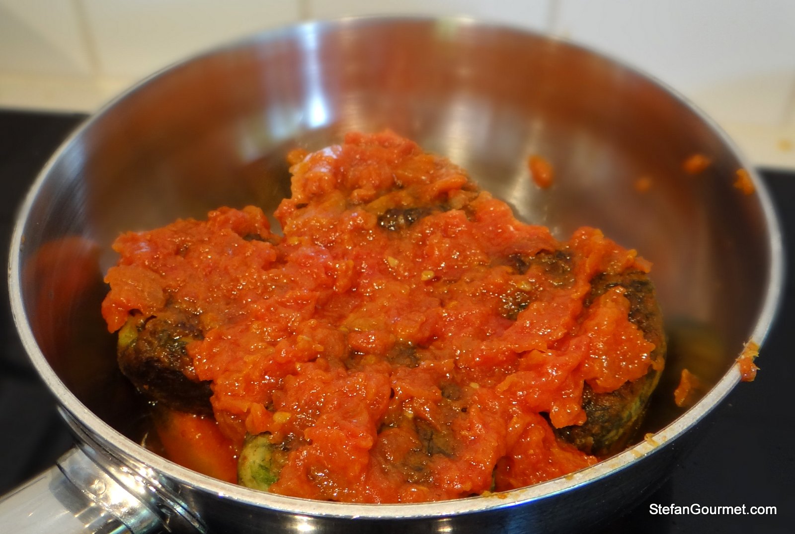 Put the browned polpette and the tomato sauce into a saucepan. Finish cooking the polpette in the tomato sauce over low heat, stirring gently now and without breaking the polpette.