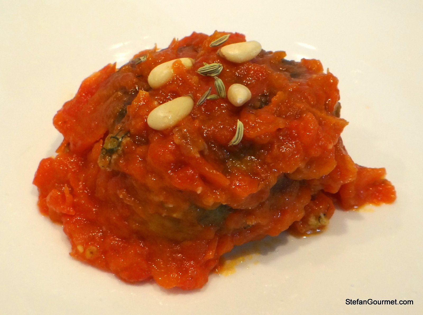Serve the polpette with the tomato sauce, garnished with pine nuts and fennel seeds.