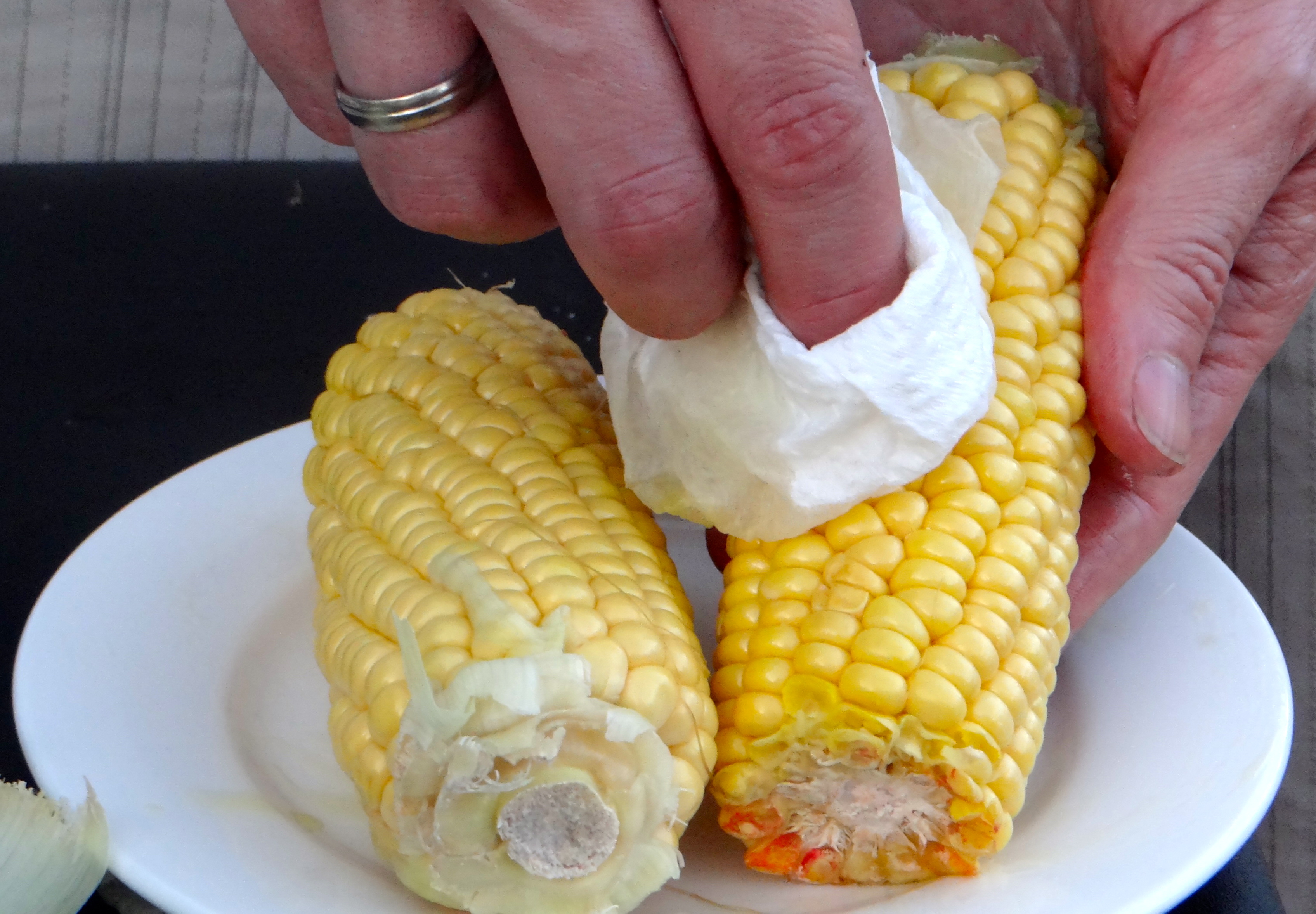 Rub the corn with olive oil and season with salt. Richard uses the husk to hold the corn, but the corn here didn’t have enough husk to use that way.