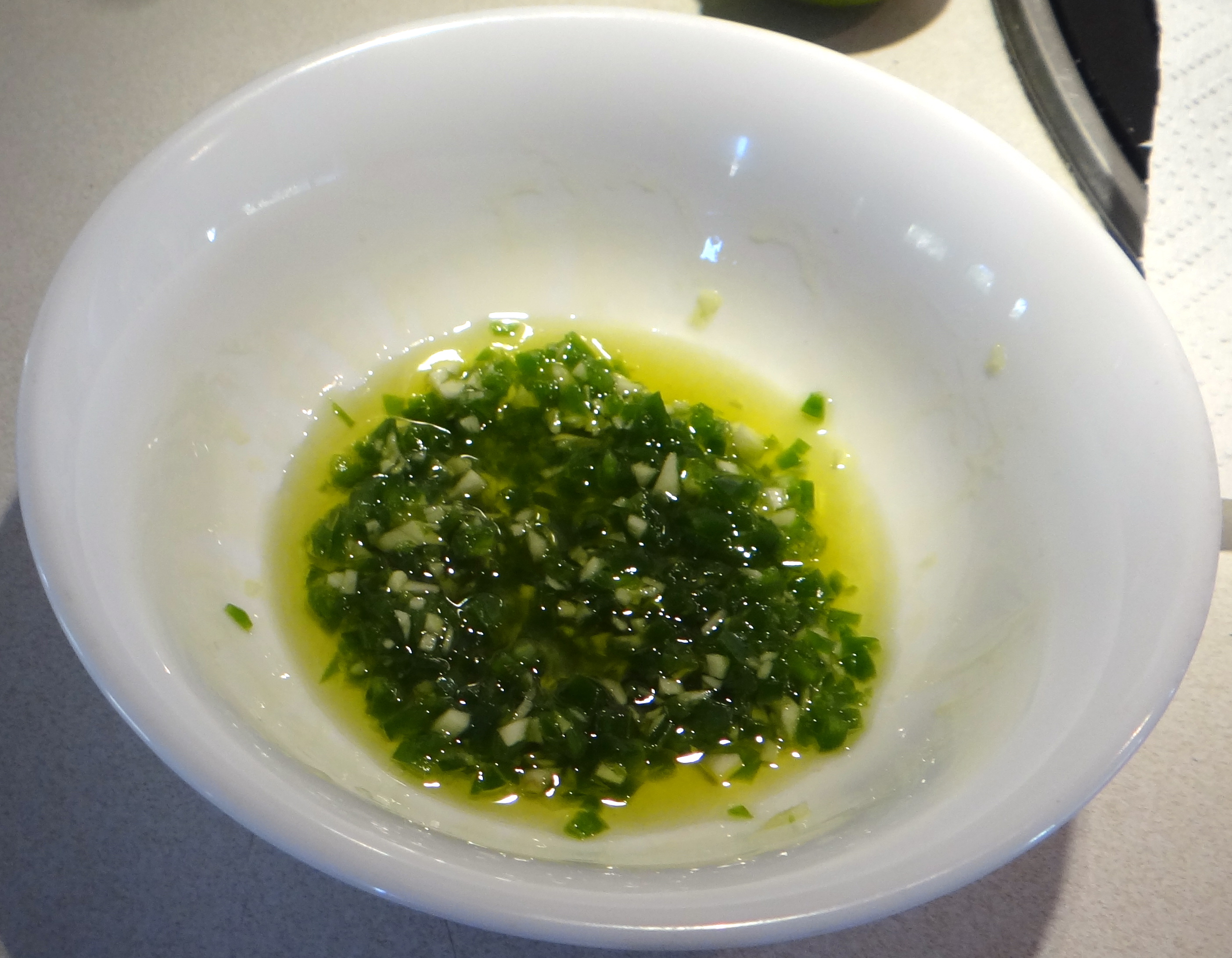 I finely chopped a jalapeno and a clove of garlic, and mixed it with some olive oil.