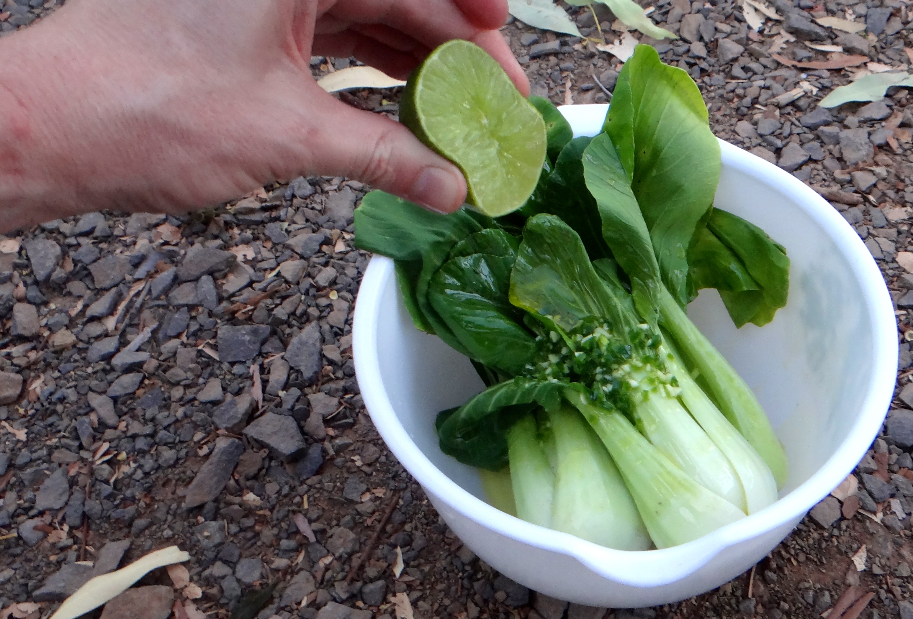 Meanwhile, we combined the baby bok choy with jalapeno, garlic, olive oil, and lime juice. This was inspired by another of Richard McGary’s recipes.