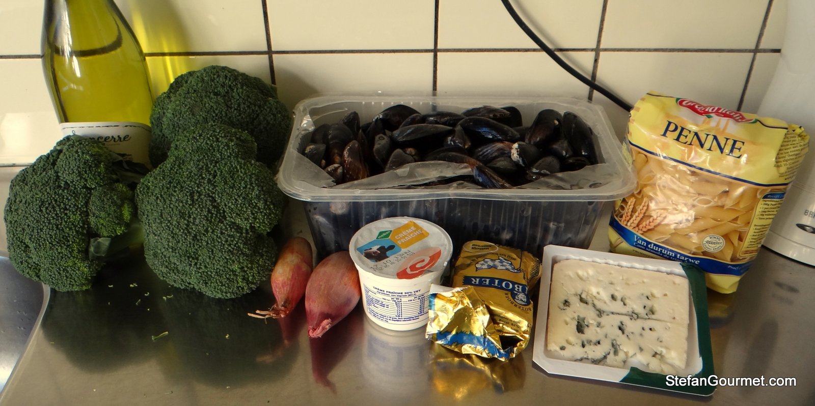 The second time I cooked in someone else’s kitchen because I couldn’t use mine, I went to my parents. (In the meantime the floor has been finished and I can use my kitchen again, and I have been so busy cooking to celebrate that I didn’t have time left to post — the posts from that cooking frenzy will follow soon.) As I was surprised how good mussels with roquefort turned out to be, I thought it’d be nice to share this with my parents as I know they love seafood. To turn it into a whole dish of Italian-French fusion, I made a combination of pasta with mussels and broccoli with the roquefort sauce. It was no surprise that it turned out nicely. If you like mussels and blue cheese, you have got to try the combination. It really works!