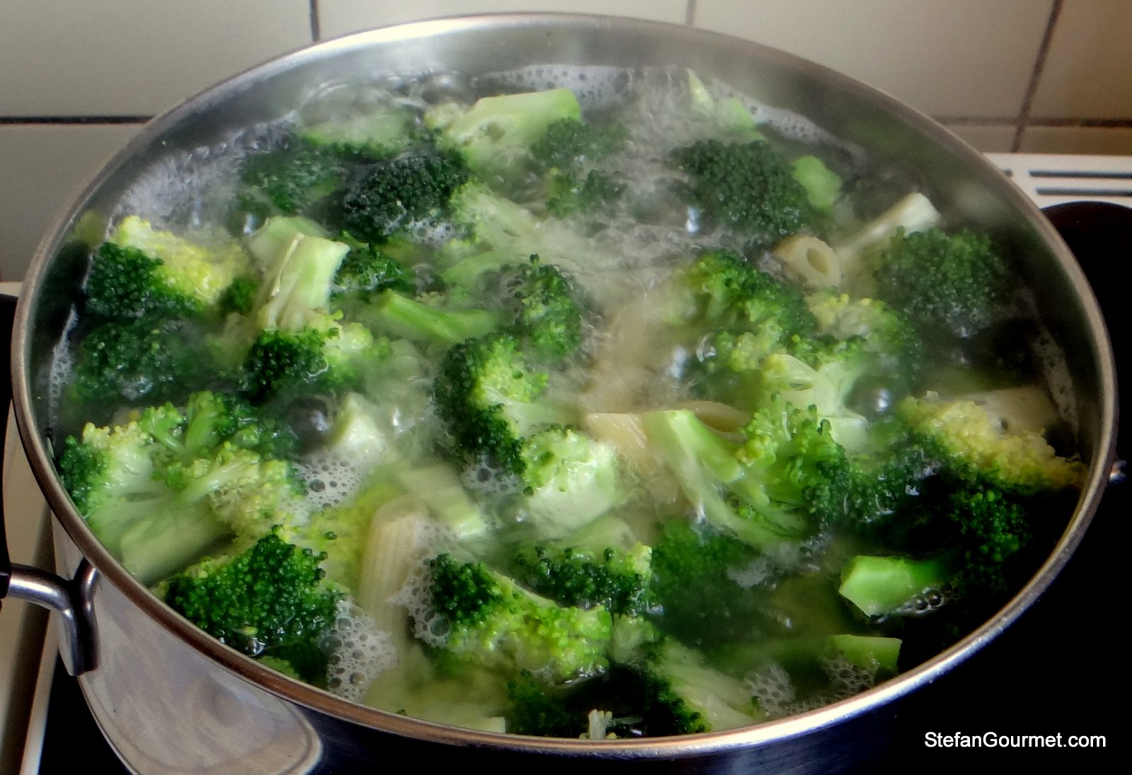 Cut the broccoli into bite size chunks. Boil the pasta and broccoli in the same pot of lightly salted water, adding the broccoli for the final 6 minutes of cooking only.