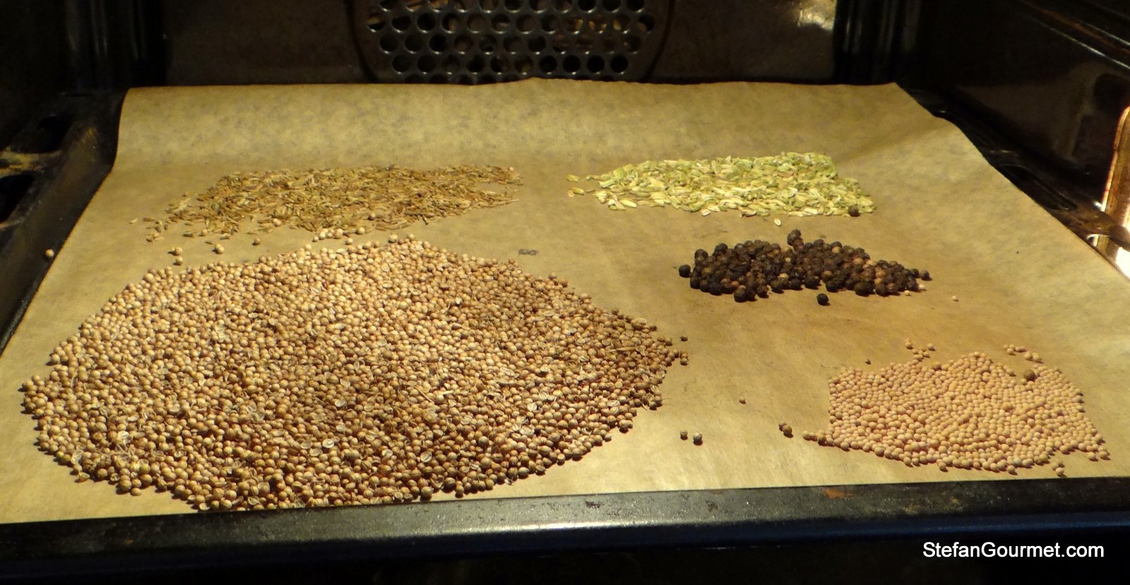 Toast the coriander seeds, cumin seeds, fennel seeds, black peppercorns, and mustard seeds in the oven for 5 minutes at 150ºC/300ºF.