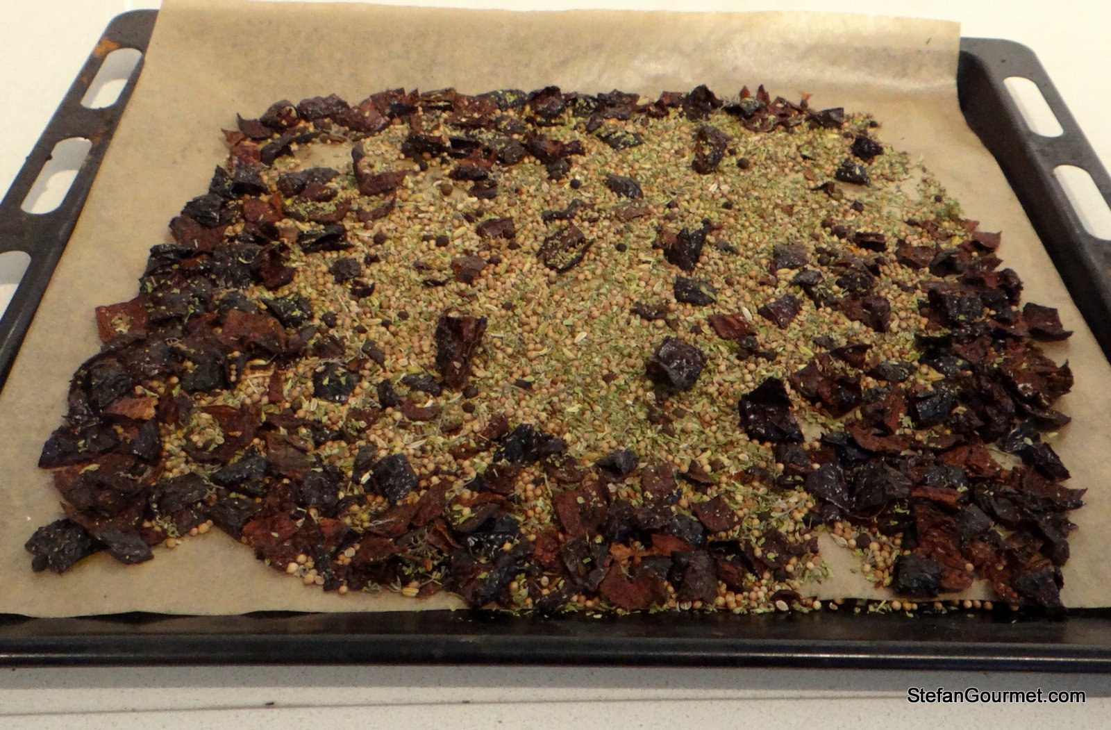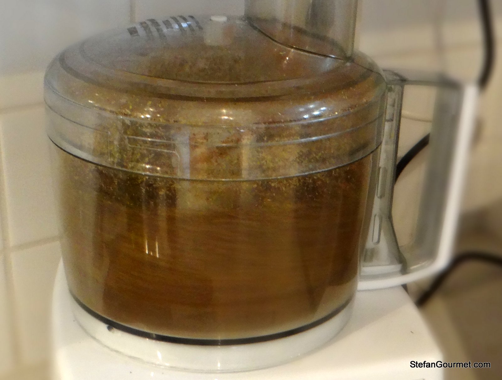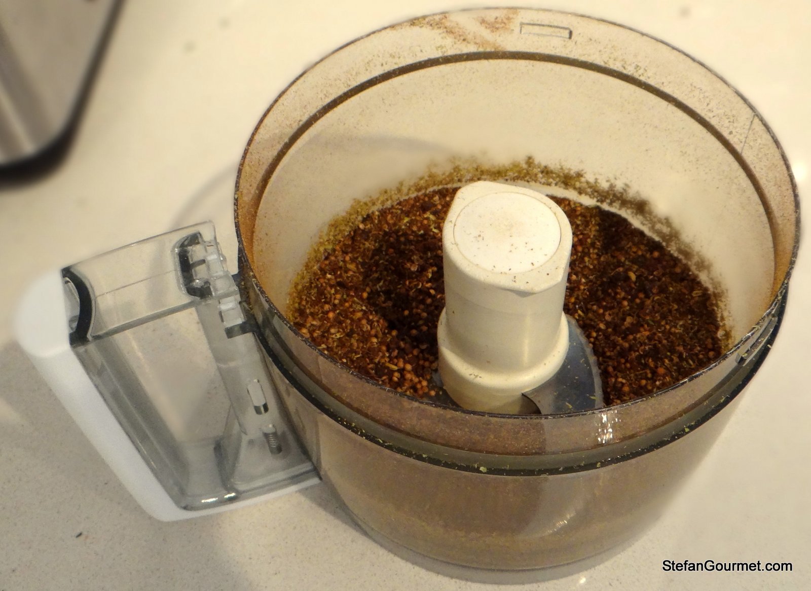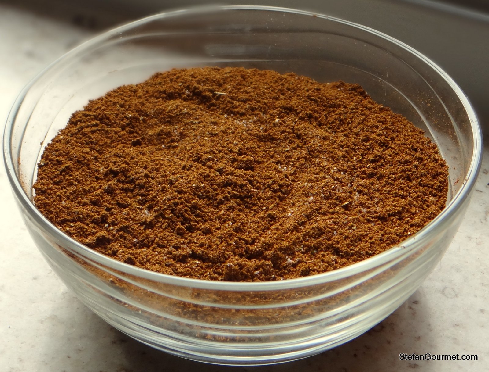 I only made three changes to Richard’s original recipe. First of all, I used less salt as you can always add more salt later but can’t take it out once it’s in. Second, I used mustard seeds rather than mustard powder as I was going to grind everything anyway. Third, my brand new German hand-cranked spice grinder didn’t succeed in grinding the mixture that I ended up with by following Richard’s recipe. Even though I toasted the ancho chiles, they were still too tough rather than brittle to grind them. And so I roasted the ancho chiles in a low oven and ground everything coarsely in my food processor before doing a fine grind in the spice grinder. That worked like a charm. I’ve already tried my own ancho chile rub on a simple steak and it tasted just like Richard’s (except for the salt).