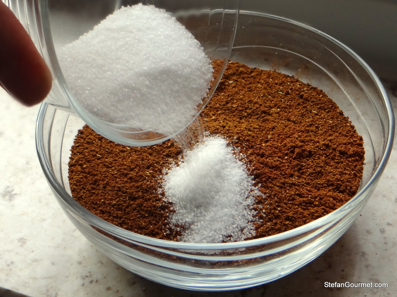 …and mix. Store in an airtight container in a cool and dark place. According to Richard it has a shelf life of 2-3 months. I don’t think it will last that long. I found it easiest to apply the mixture by mixing it with olive oil and then rubbing it on the meat or fish before grilling it.