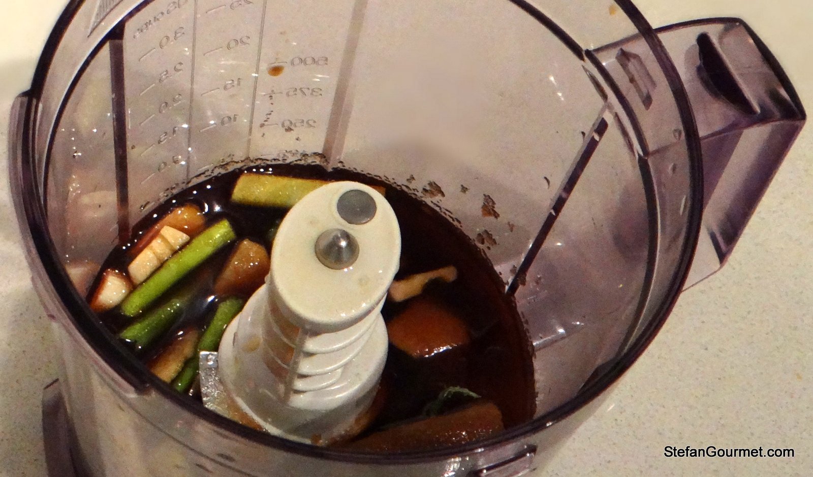 Combine ginger, garlic, green onion, sugar, mirin, soy sauce, and fish sauce in the blender.