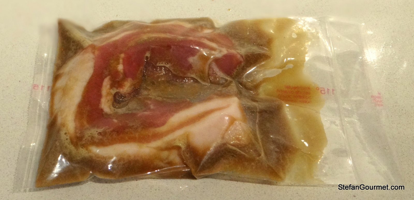 Vacuum seal the pork belly with this mixture. This is easiest in a chamber vacuum sealer, but you can also use a ziploc pouch and the water displacement method.