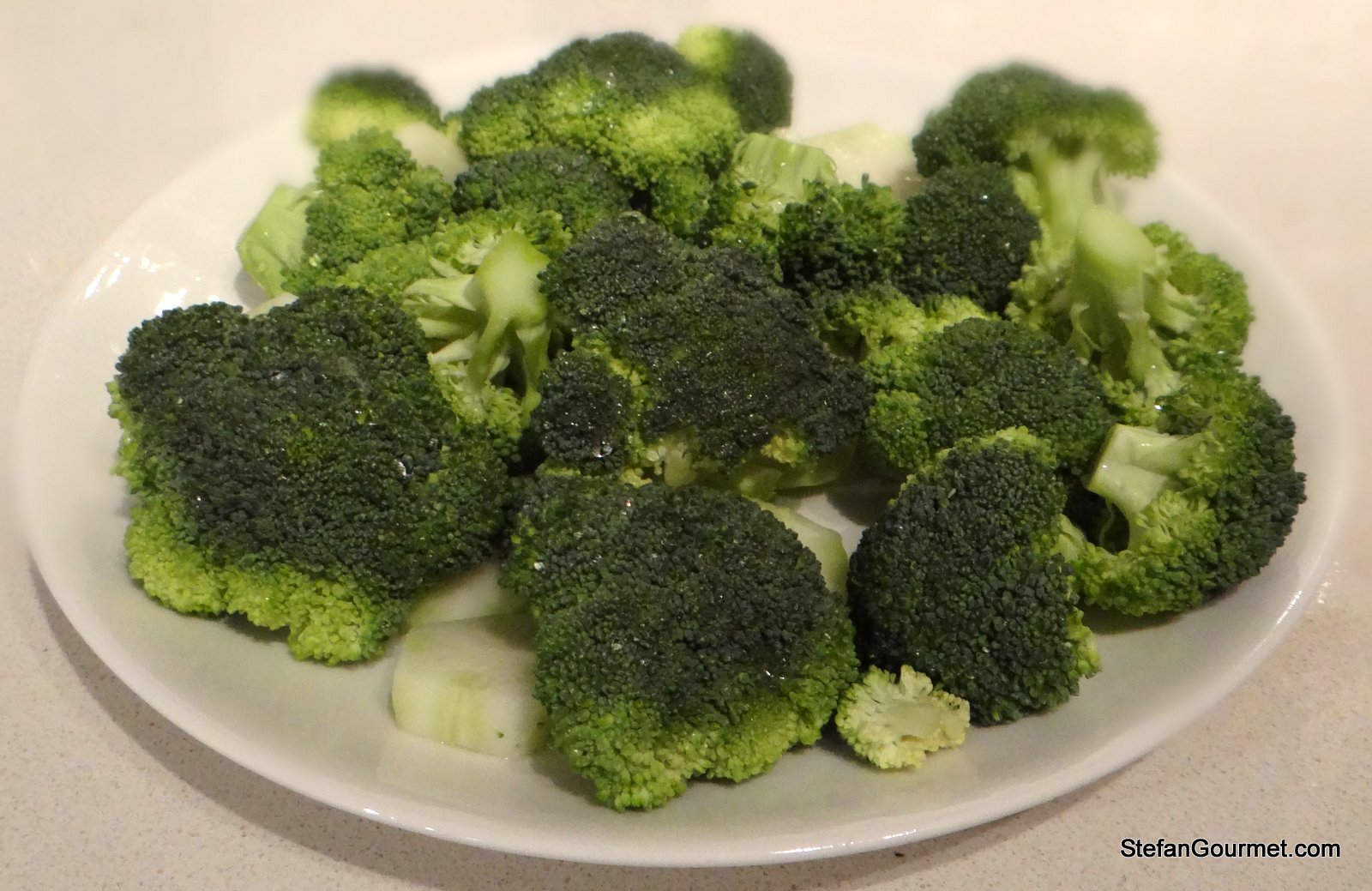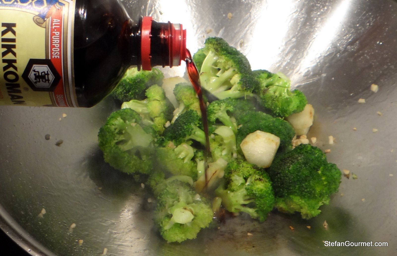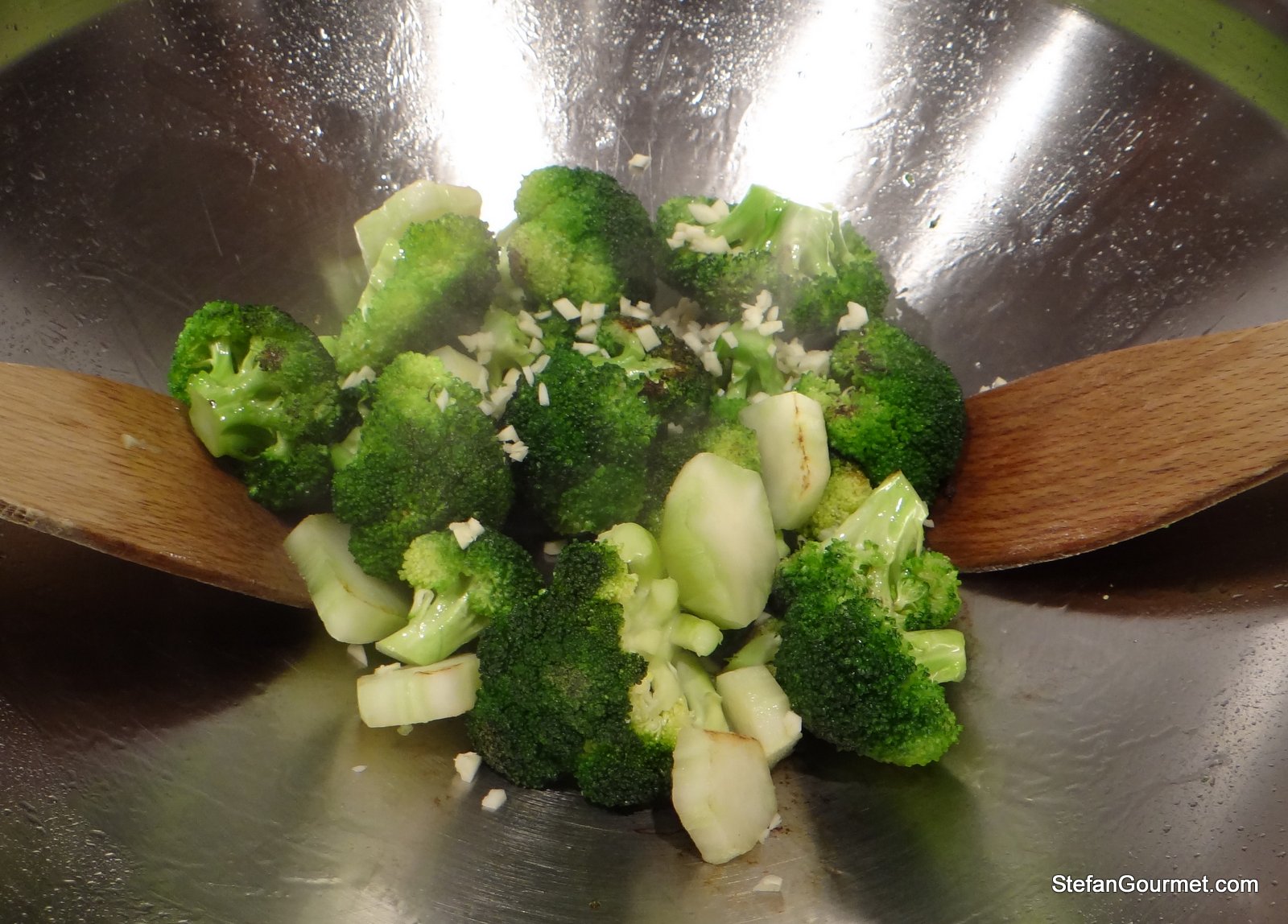 Meanwhile, stir fry the broccoli in the oil. When the broccoli starts to brown, add the garlic and lower the heat. Stir fry a bit longer, being careful not to burn the garlic.