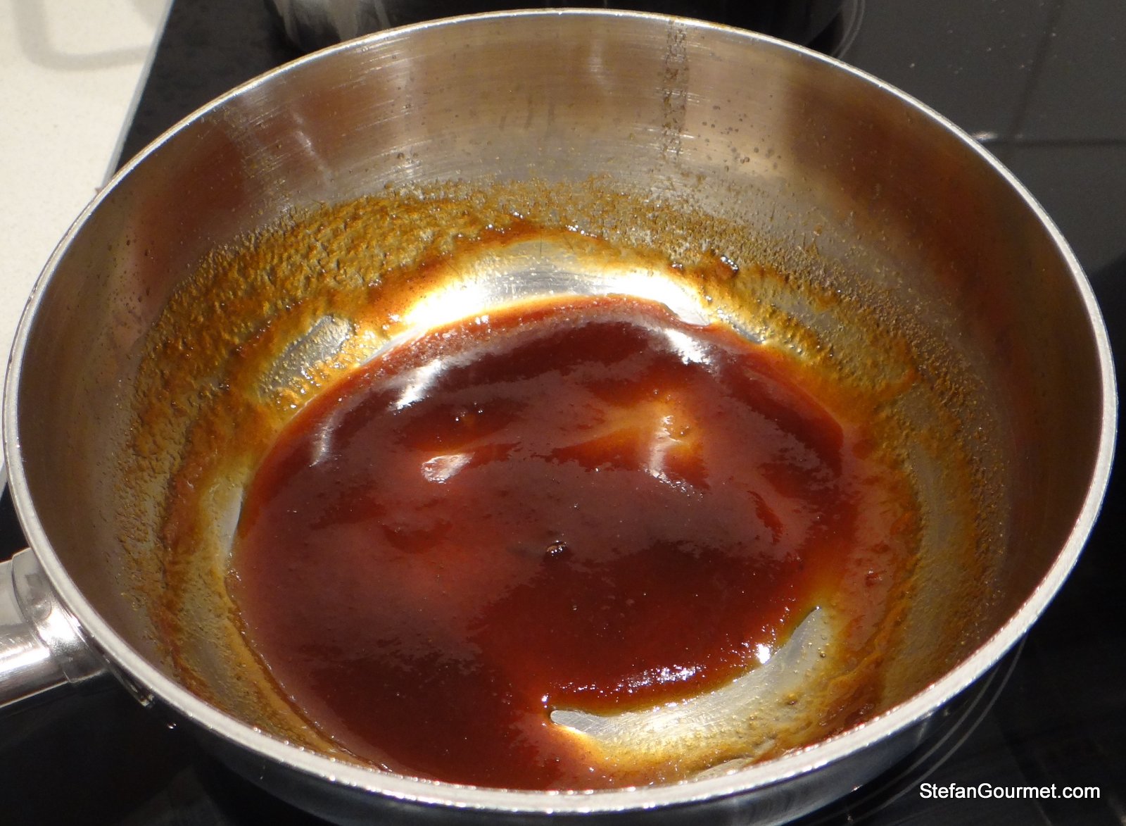 Bring to a boil and lower the heat to a mere simmer. Simmer the sauce until it is thick and syrupy, stirring now and then. Be careful not to allow the sauce to burn.