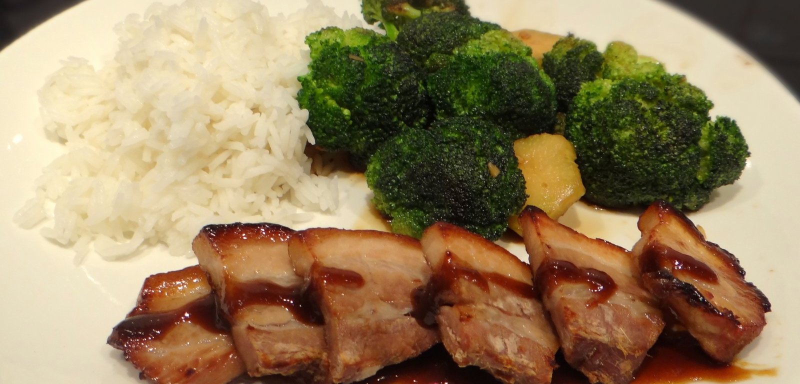 Serve the pork belly with the sauce and garlicky broccoli on warm plates with rice.