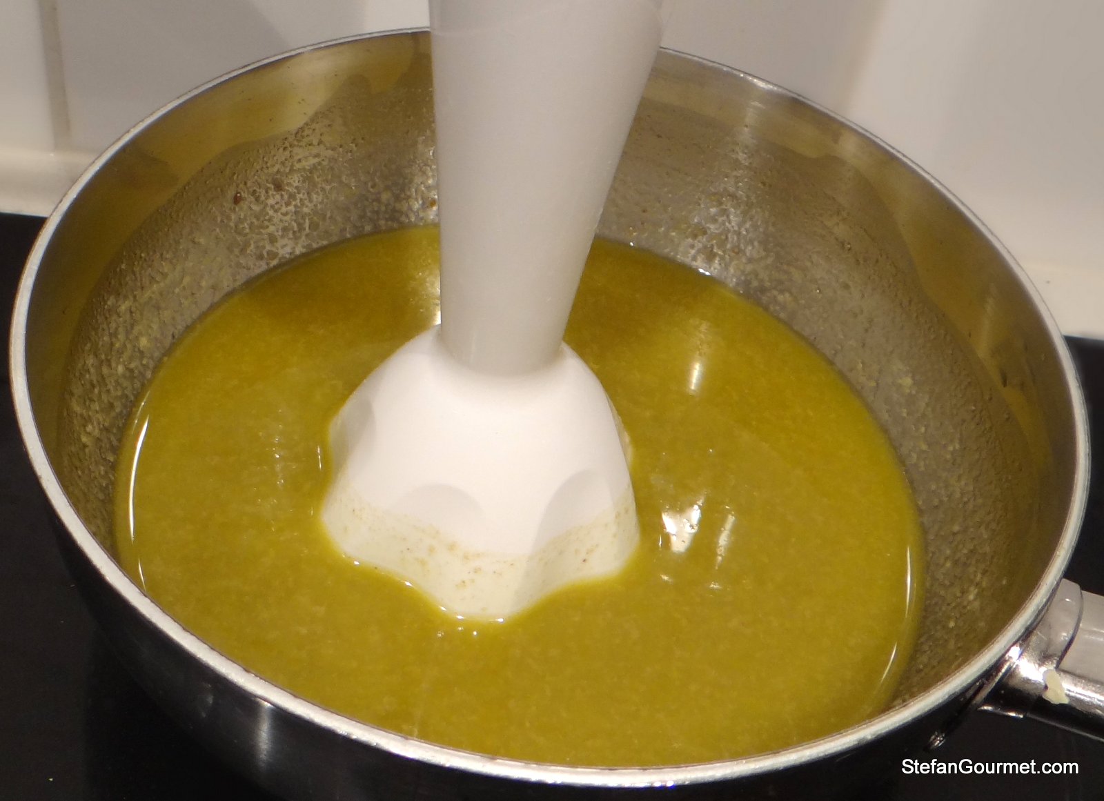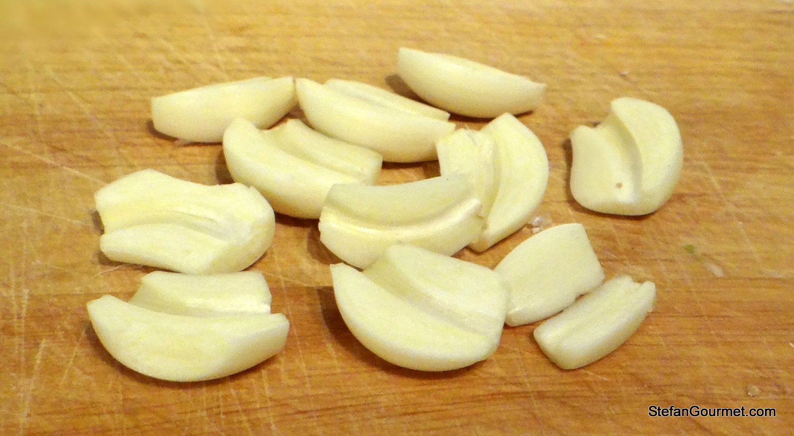 Peel the garlic and remove the green center. Mince the garlic very fine. Many recipes require a whole bulb of garlic per person!