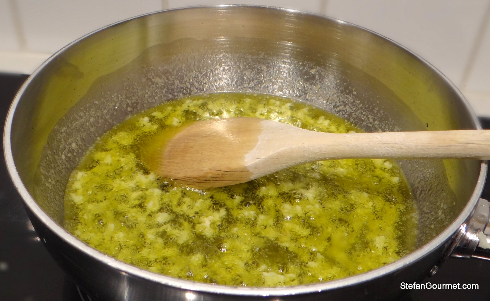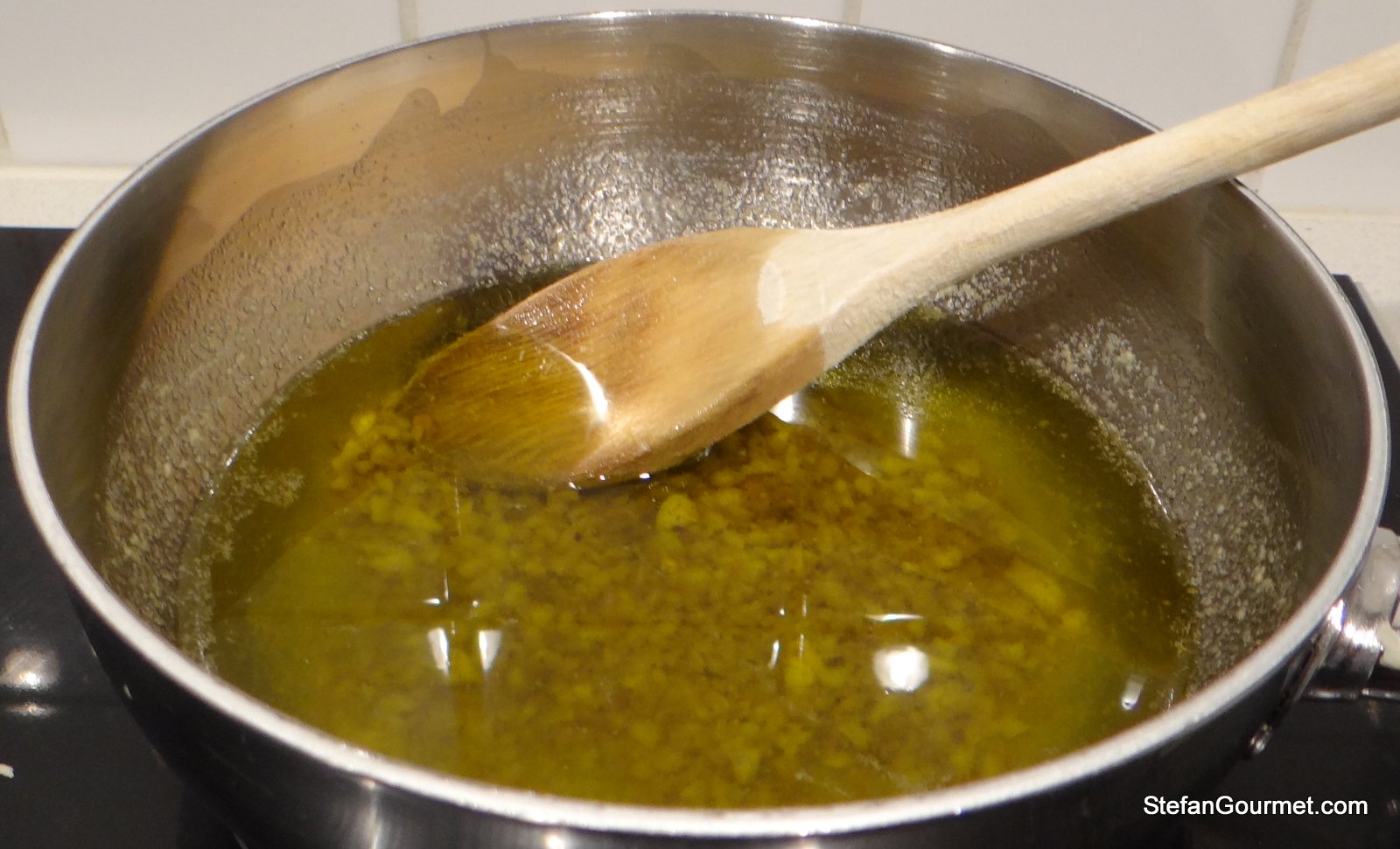 Heat the oil and add the garlic. Cook over medium heat until the garlic starts to turn slightly golden.
