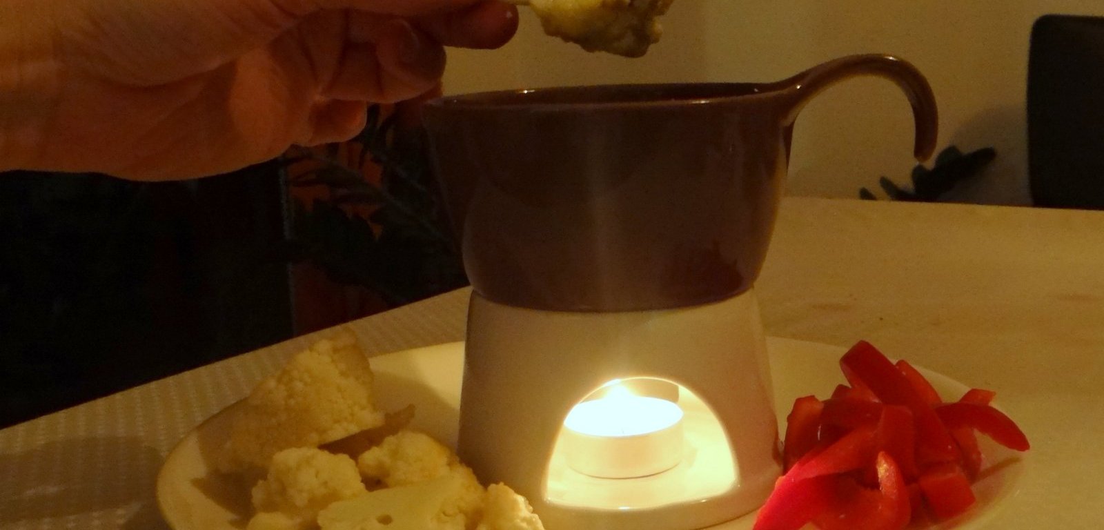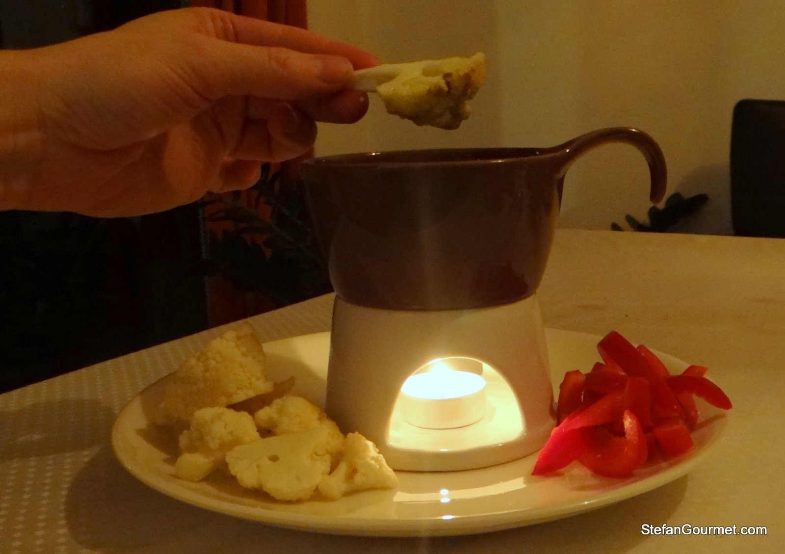 I tried it with a lot of vegetables including celery, fennel, and jerasulem artichoke, and decided that I liked red bell peppers and cauliflower best. In Piemonte the bagna cauda is served in an earthenware vessel with a flame to keep it warm called a fujot, and during the trial run I also noticed that I needed one as well. Traditional fujot are difficult to find outside of Piemonte, but I found something that was intended for chocolate fondue that worked very well 🙂