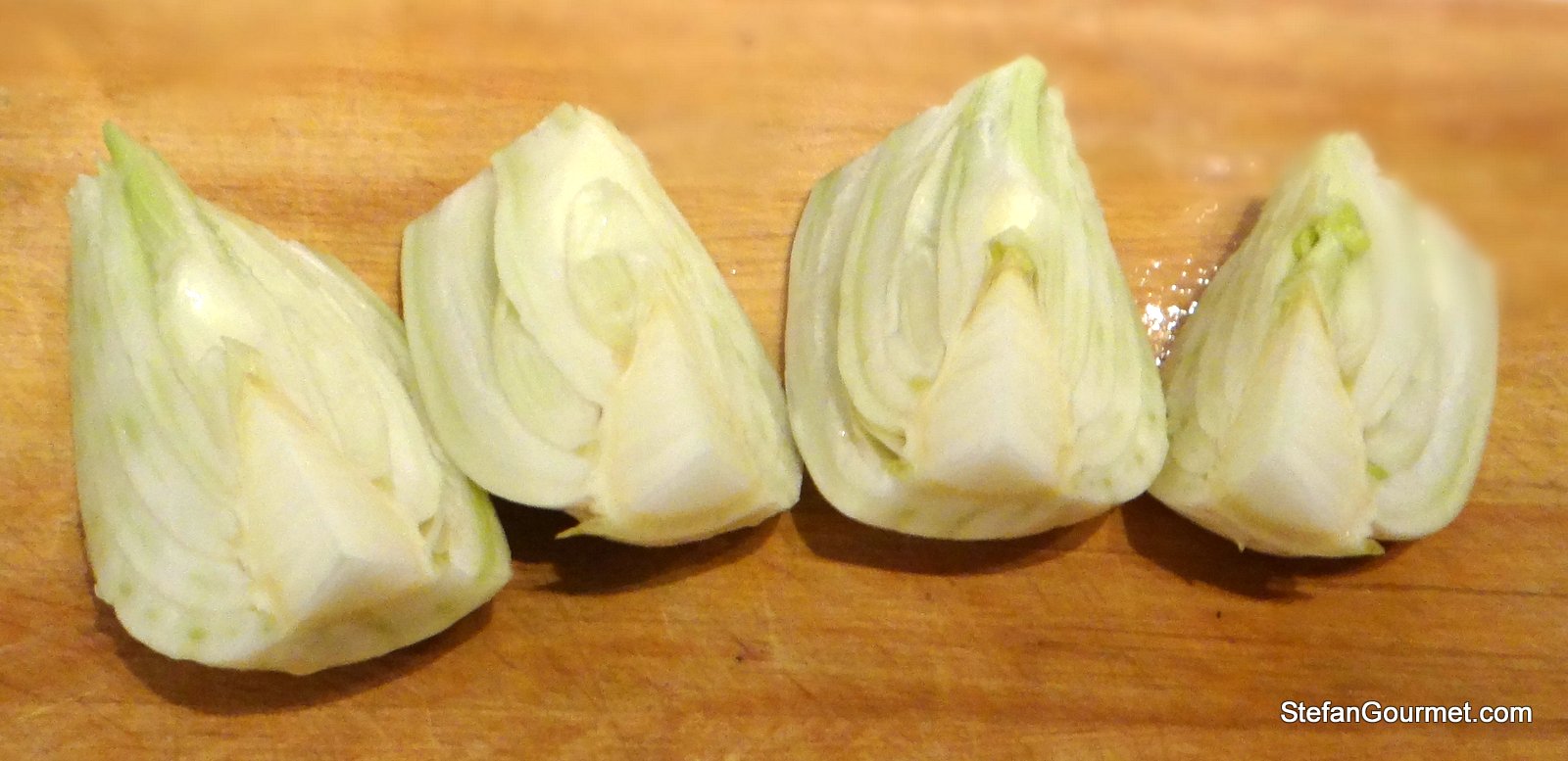 Wash and dry the fennel bulbs. Cut off the base and the fronds. Cut the fennel into quarters (or halves, if using small bulbs).