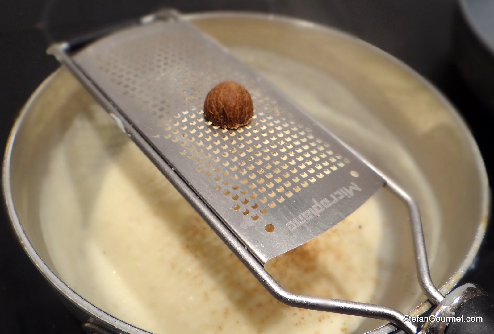 Season the bechamel with freshly grated nutmeg, freshly ground white pepper, and salt.