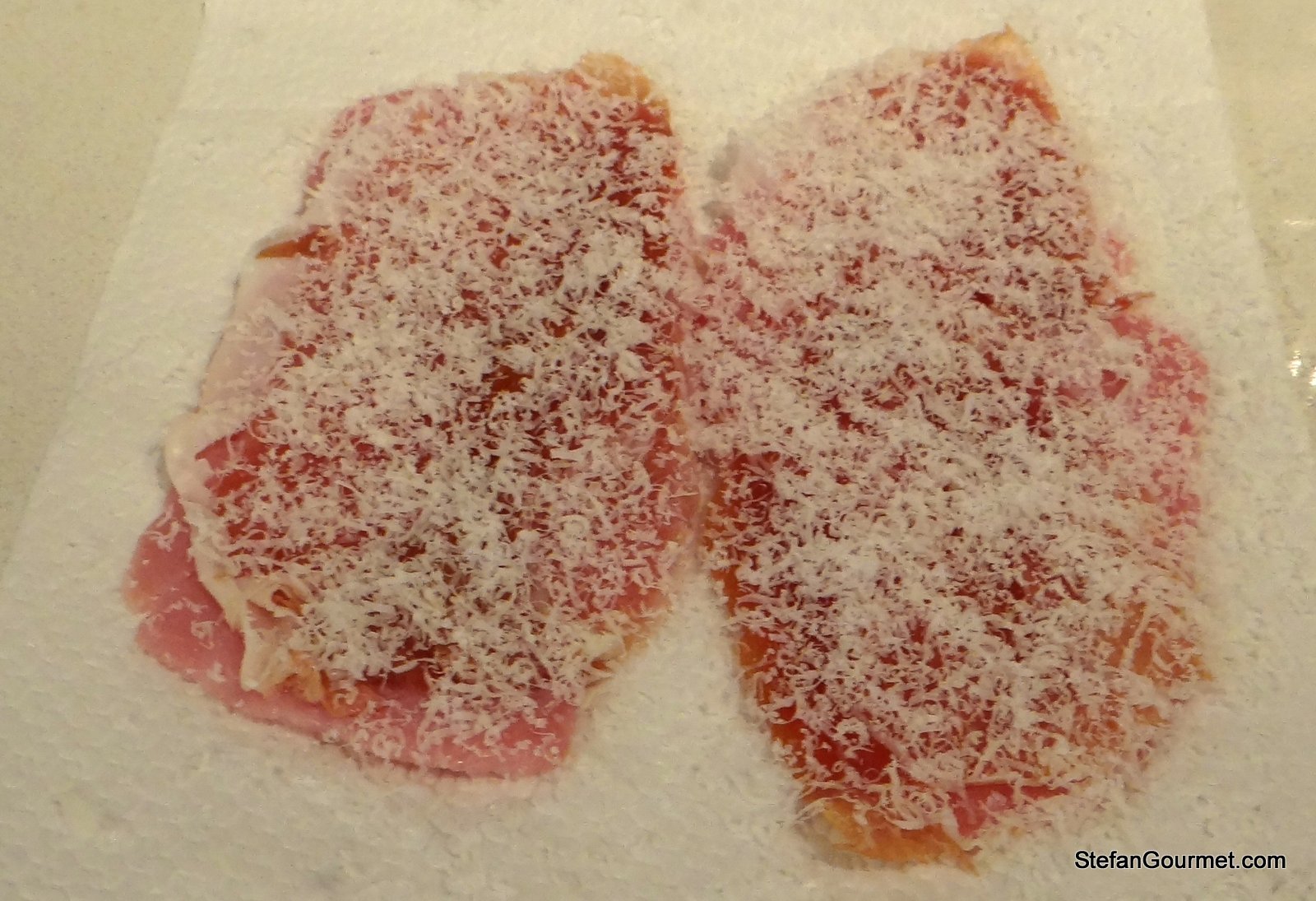 Cover the scaloppine with the prosciutto and sprinkle with parmigiano.