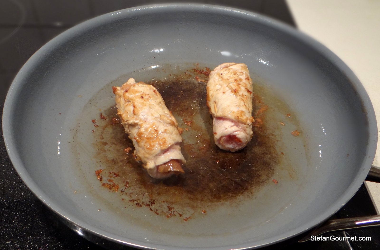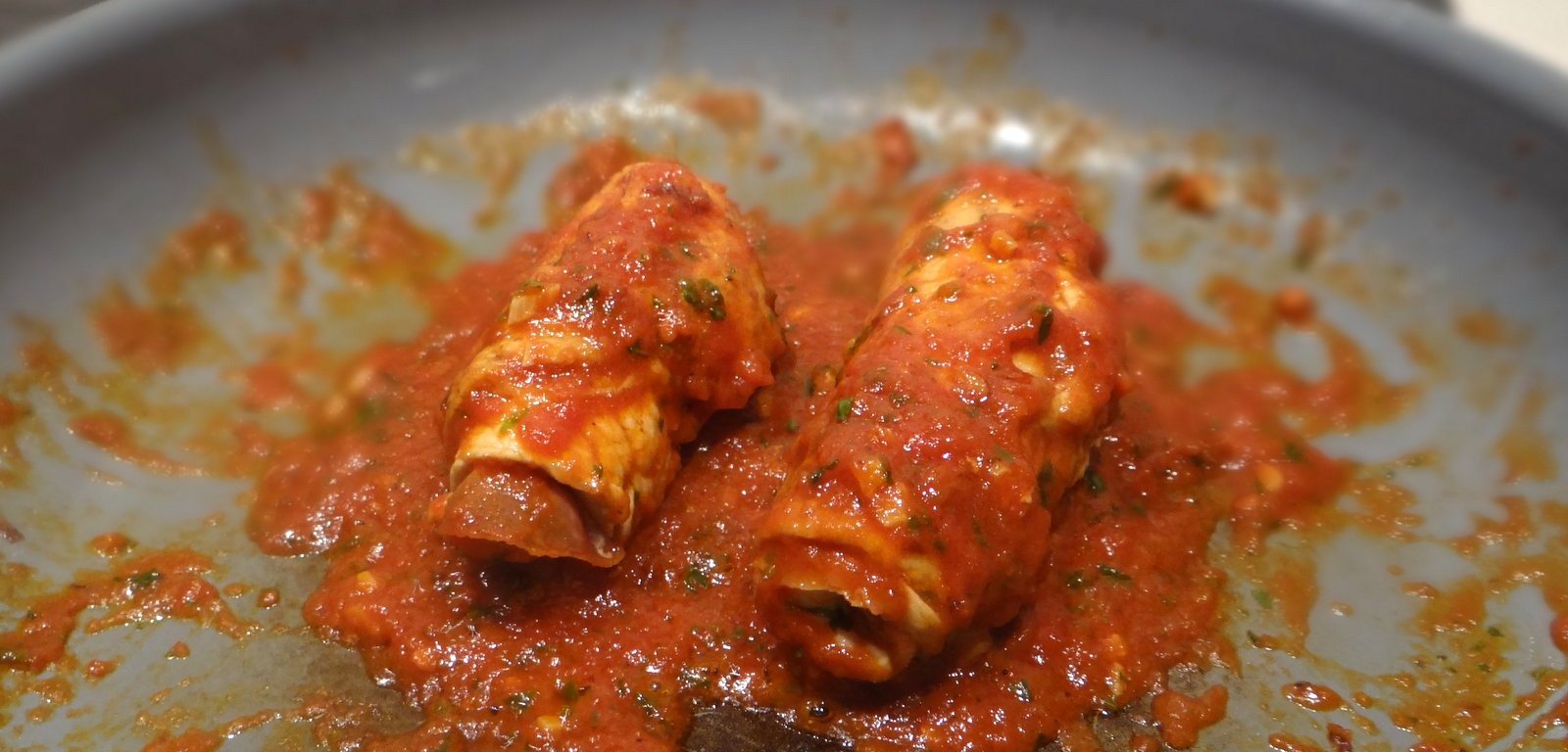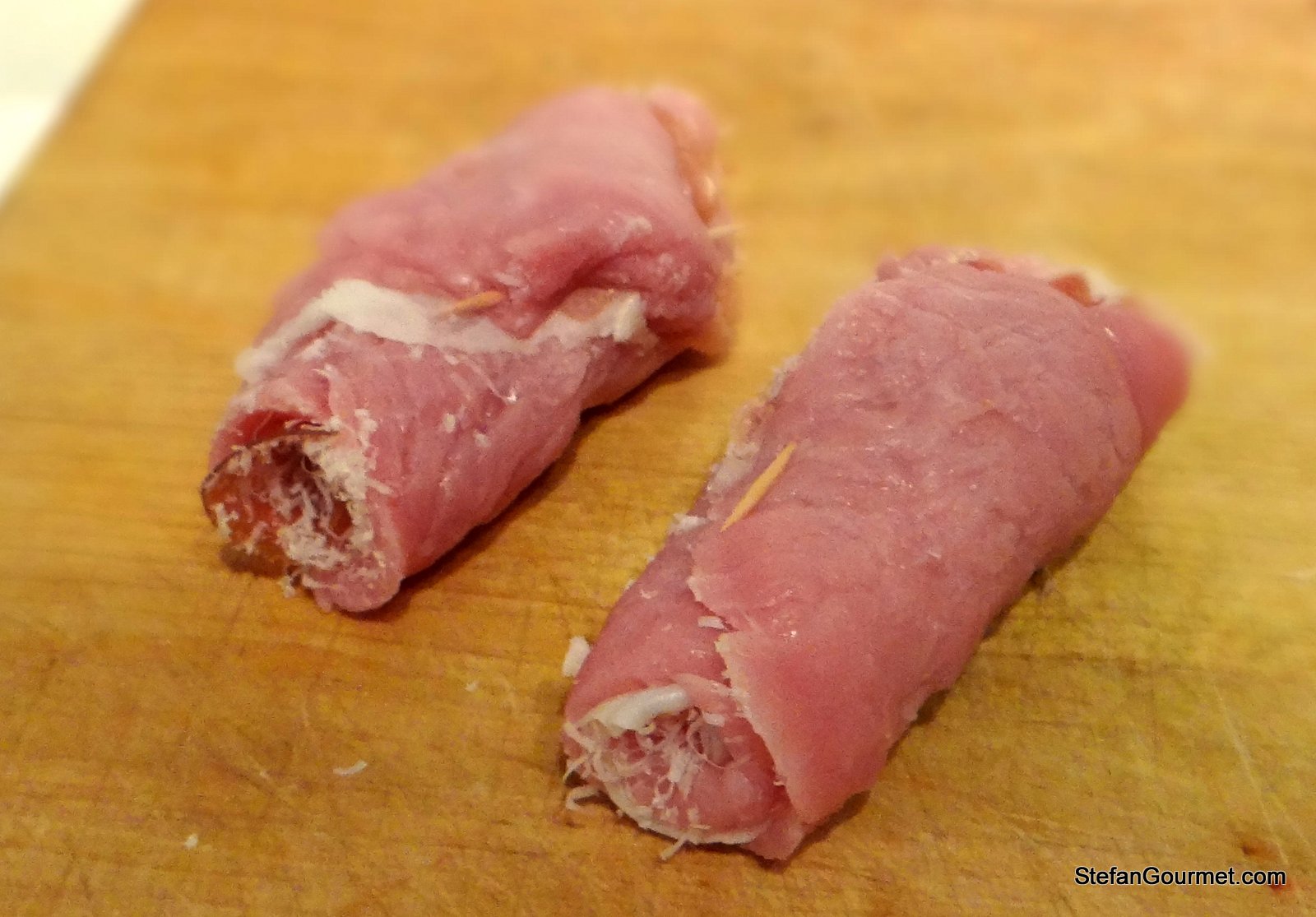 I don’t have many cookery books (at least not compared to many of you), and I do not use the ones that I do have very often. There is one exception, and that is my collection of Biba Caggiano books. By now I’ve probably cooked the majority of recipes in there, but there are still some that I haven’t tried. This recipe for fast stuffed veal bundles from “Modern Italian Cooking”, the first of her books that I owned and the one that got me started on Italian cooking, is one that I only recently tried for the first time. Perhaps because I thought it was too similar to Saltimbocca alla Romana, which is on the next page and one of my favorites. The main differences are that saltimbocca are never rolled up but always served flat, and that these stuffed veal bundles are cooked in a tomato sauce. They also take a bit longer to cook than saltimbocca.