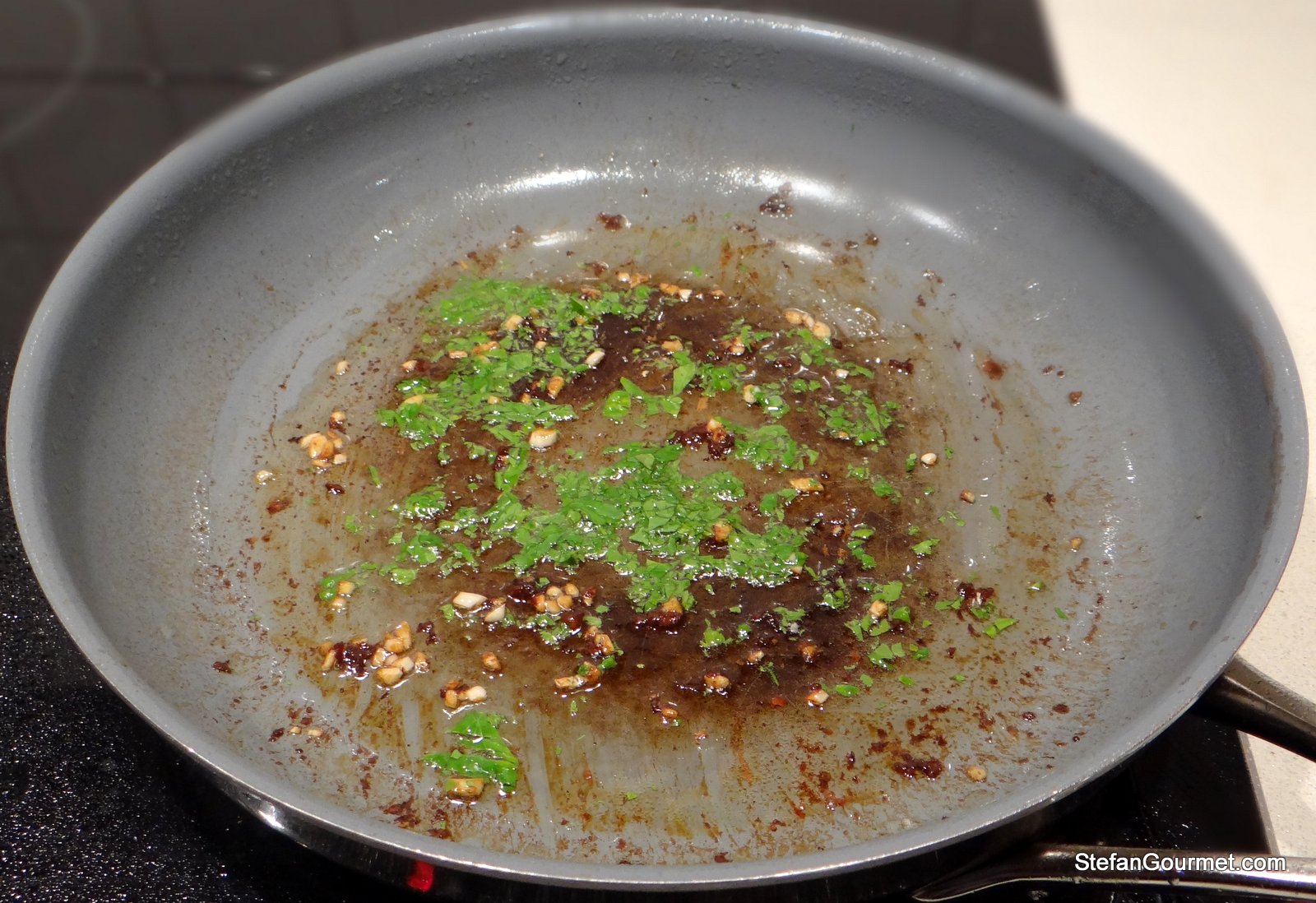 Add parsley and garlic, and stir for a minute. Do not let the garlic burn.