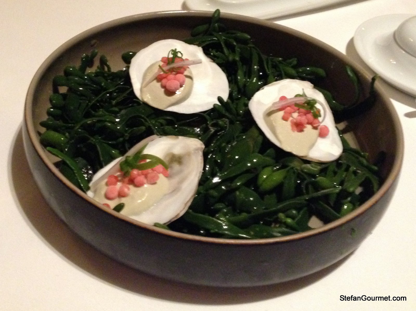 Another familiar amuse: oyster cream with red wine vinegar pearls.