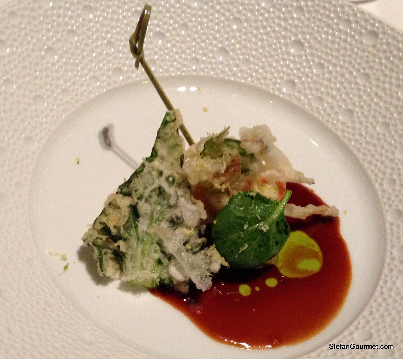 The langoustine (hidden behind the tempura of vegetables) had the best cuisson I’ve ever had. Langoustine is very difficult to cook right, as it overcooks very easily and then becomes too soft and the flavor loses its freshness. This one was cooked just perfect. It was served with own ‘jus’, cilantro oil, and coconut, and a skewer of langoustine marinated in a fruit called ‘hand of Buddha’. As with the other dishes, the flavors were perfectly balanced and blended into one. Even the cilantro blended in perfectly. The tempura was perhaps a touch too crunchy rather than light and crispy, but that is a minor detail. The wine pairing with a viognier, again an usual one as it was quite light, was very good. 9/10