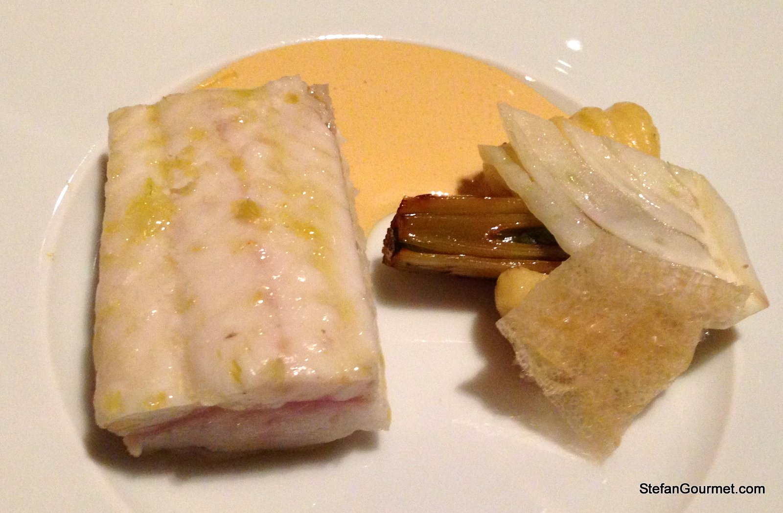 The fillet of sole was perfectly cooked and served with a sea-urchin sauce (that was very mild), crunchy fennel, braised fennel, and citrus gnocchi. A crunchy element was provided by a crunchy piece of sole skin. The combination of flavors worked very well, and the pairing with a godello from Galicia was simply outstanding. This is the type of wine pairing that only happens once in a while: the wine and the food interact and make new flavors stand out in each other. 10/10