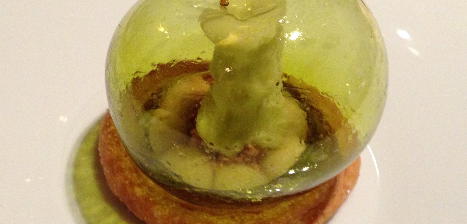 The dessert was a showcase of technical prowess: an apple tart with a transparent ‘apple’ on top with inside a ‘core’ made of apple sorbet ice cream. The ice cream and tart had great taste. The transparent apple tasted mostly of sugar. The wine was another unusual one: a late harvest white wine from red grapes from Austria. It wasn’t too sweet and worked very well with the dessert. 9/10