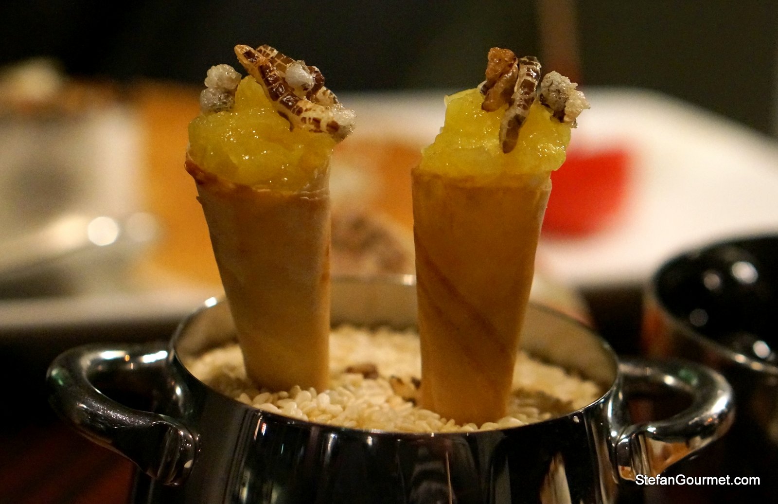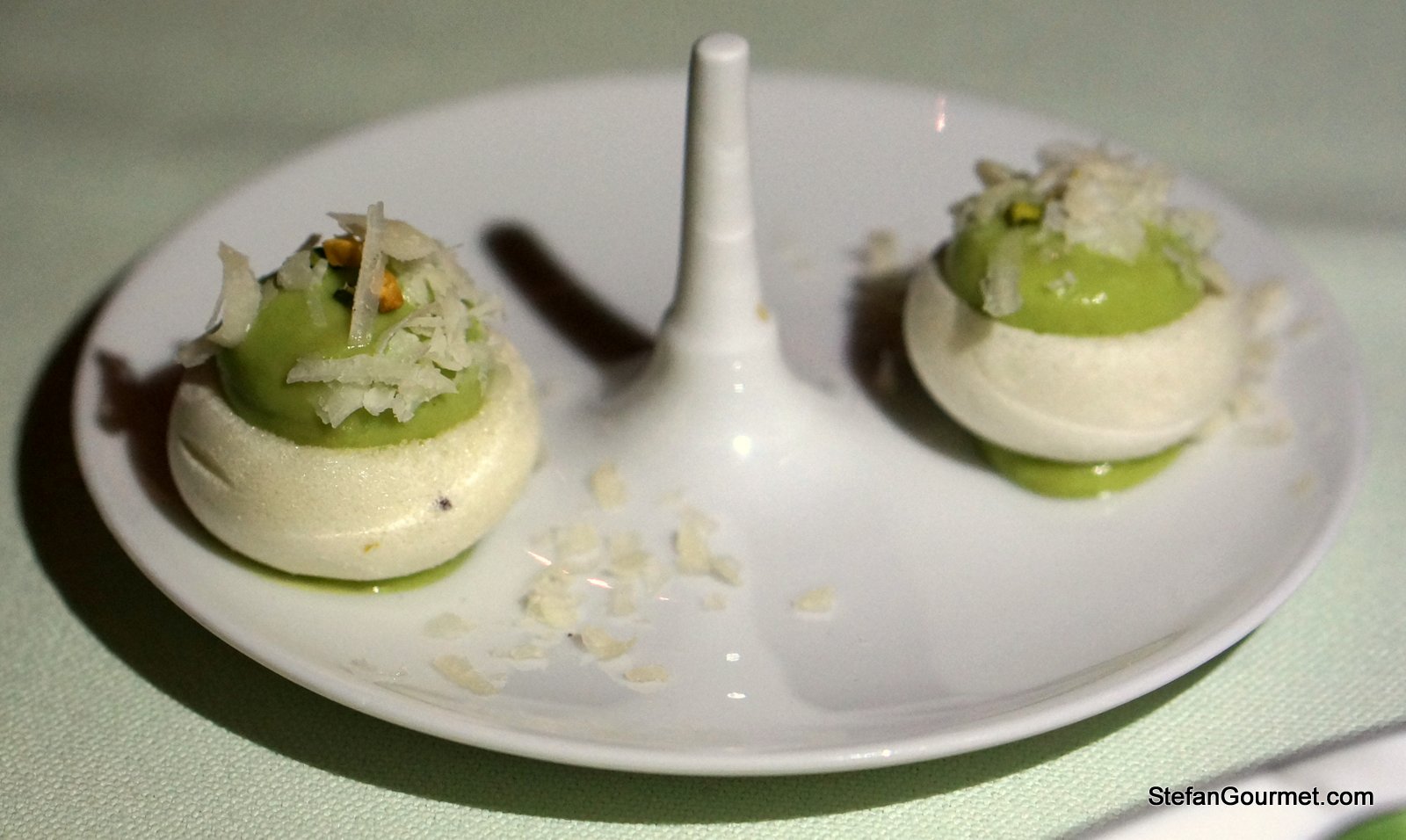 The first set of amuses included a quince lollypop, shrimp cracker, and beer foam with sesame seeds.