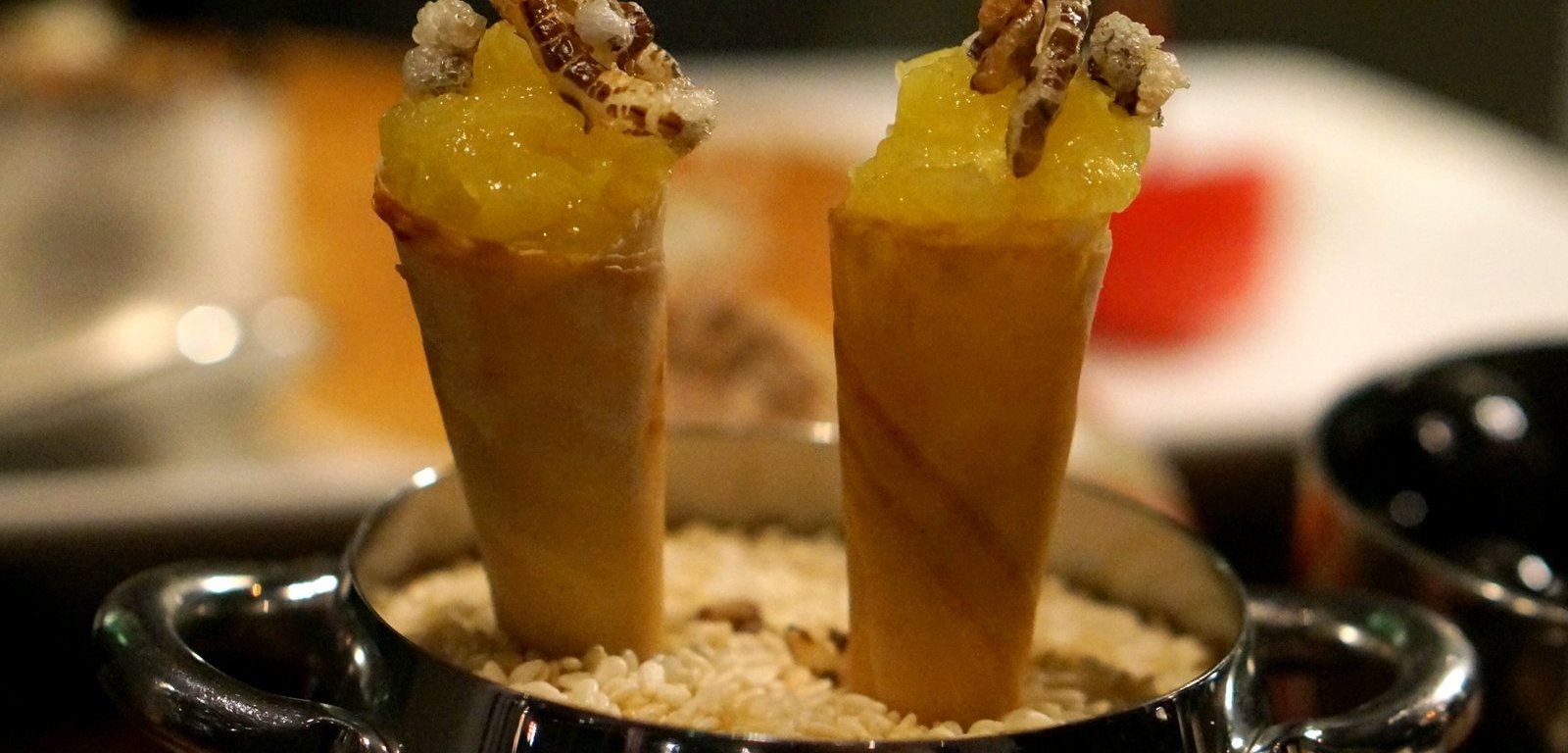 Crispy cones with crispy rice, butternut squash, and cabbage.