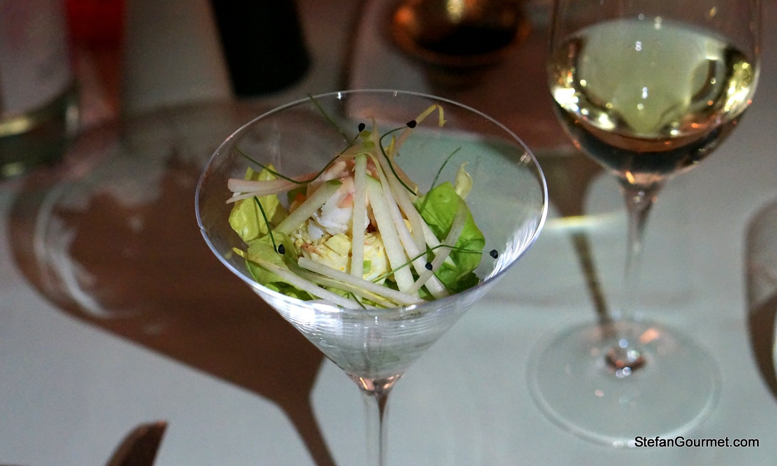 Also part of the first course: a king crab cocktail with shaved fennel and lettuce. All of this paired with a 2012 sauvignon blanc kabinett from Baden (Germany), which was served a bit too cold but worked well with most of the elements of the first course. A lot of different flavors in this course that certainly did not clash, but not spectacular either. 8/10