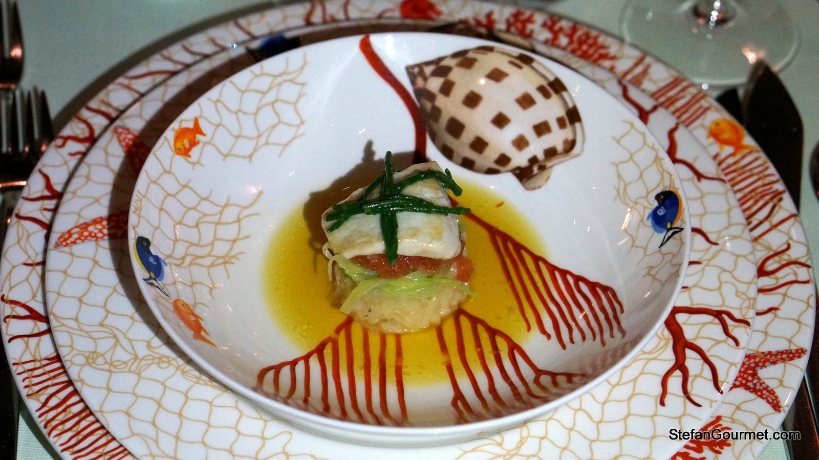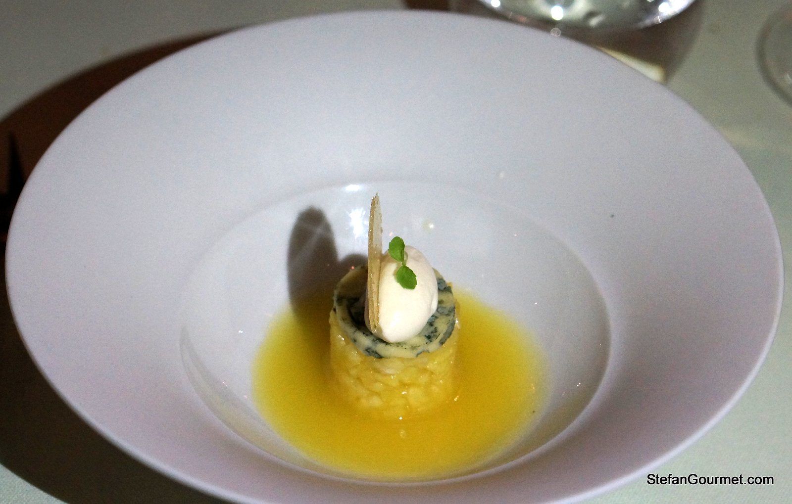 The other part was ‘caramelized’ lobster with shaved fennel and the same dressing as on the king crab cocktail. The oaked roussane/viognier from Gard in the south of France was very nice, but a bit strong for the subtle flavors of the dish. The seabass was perfectly cooked, but the risotto was not al dente and the stock was a bit low on flavor. 8/10