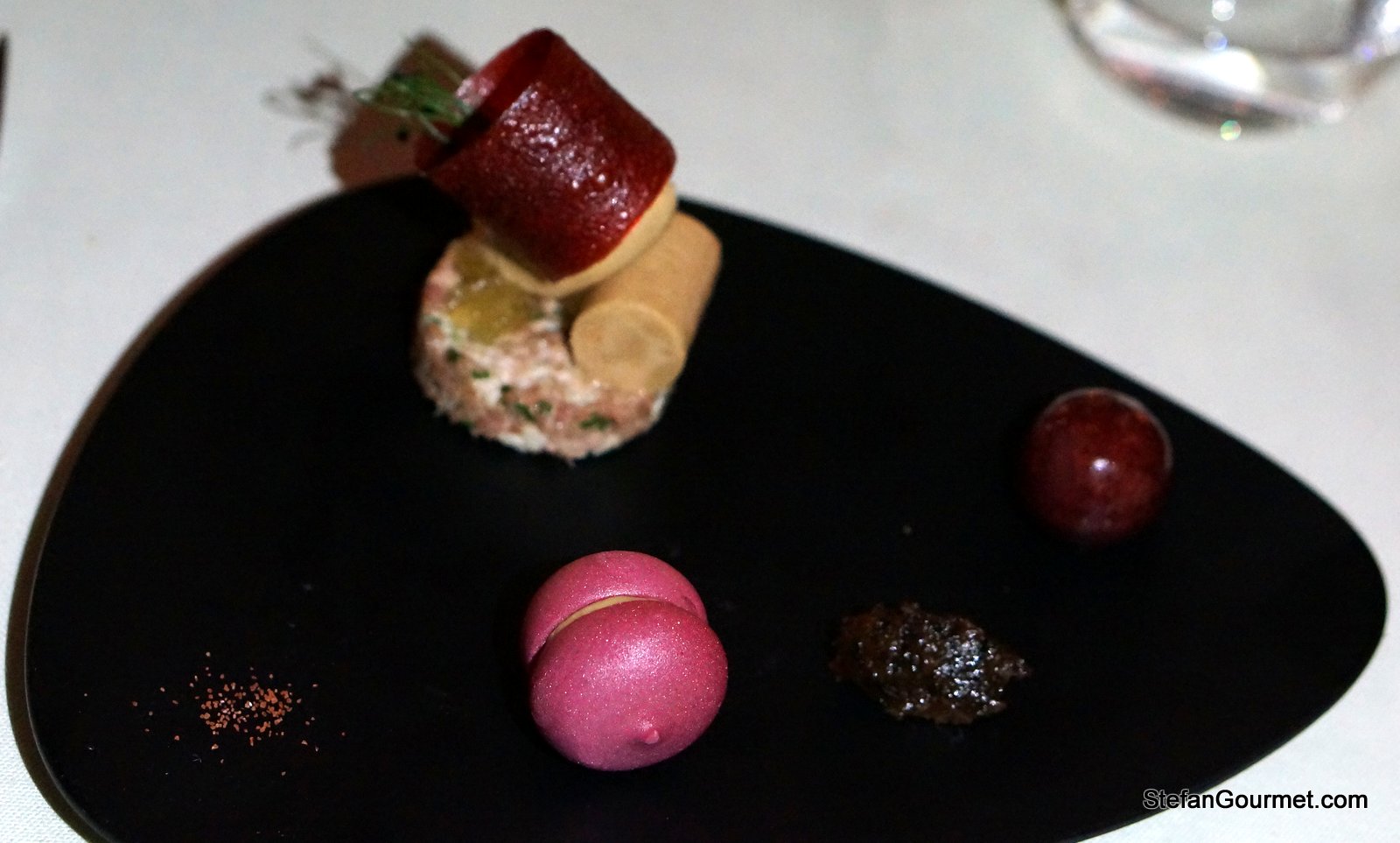 The next course: duck confit, ballottine of foie gras, foie gras icecream, foie gras bonbon and red port jelly was the best of the evening. Layers of deep flavors that worked very well together. The crispy beetroot cylinder had a very good beetroot flavor and was very crispy. It almost seemed like a dish from a different restaurant. The pairing with a chilled Graham’s tawny port worked well, although a slightly better tawny port (e.g. 20 years old) would have been nice. 9/10