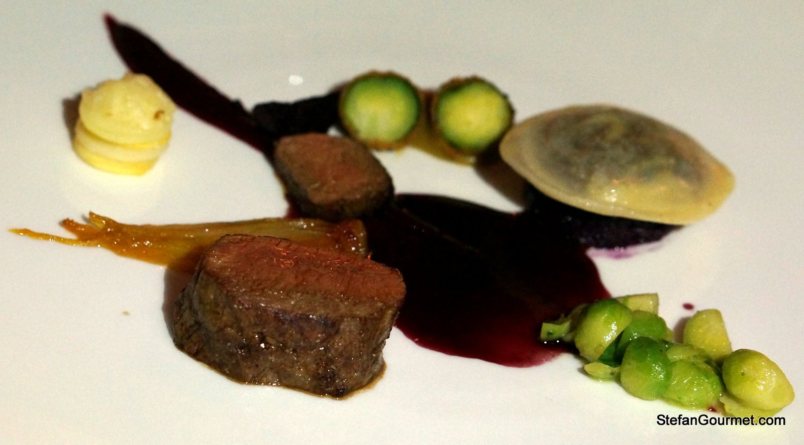 Fillet of roe deer with creamed beetroot, brussels sprouts, red cabbage, and onion raviolo, another classic dish. Perhaps it’s because I’m not a big fan of either brussel sprouts or red cabbage, but I wasn’t crazy about this. The roe dee was nicely medium rare, but it tasted more ‘gamey’ than I like (and roe deer doesn’t have to taste like that). It was first paired with a 2009 Ripasso from Veneto, but that had so much ‘green bell pepper’ (i.e. unripe grapes or stems) that we didn’t like it at all. Without any discussion it was replaced with a South African bordeaux blend that worked quite well. 8/10