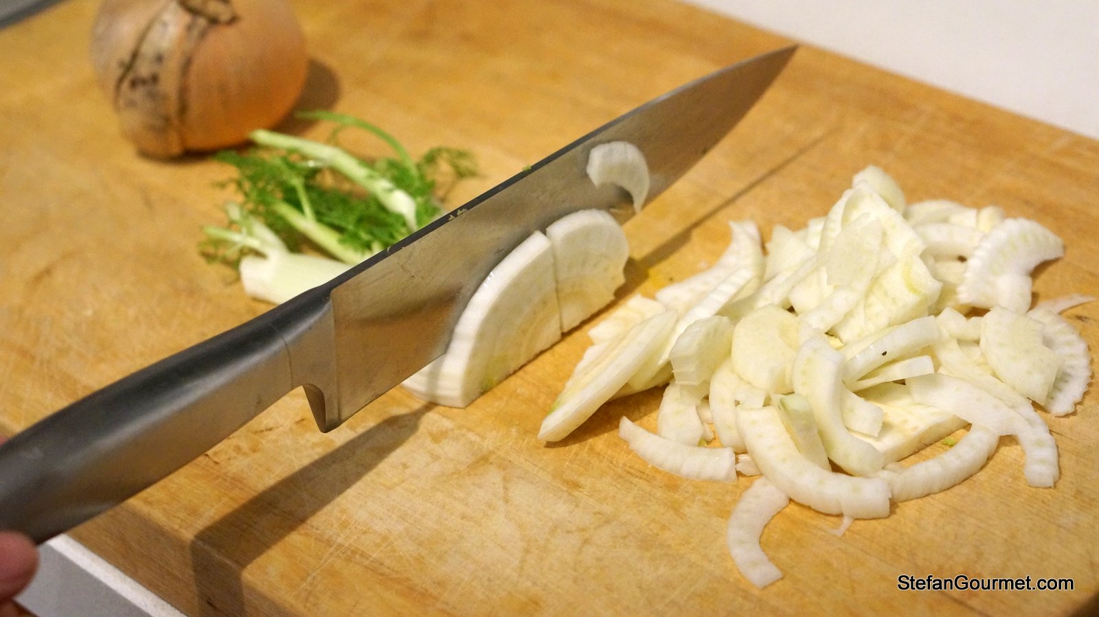 To prepare the sauce, cut the fennel and the onion in quarters and then in thin slices.
