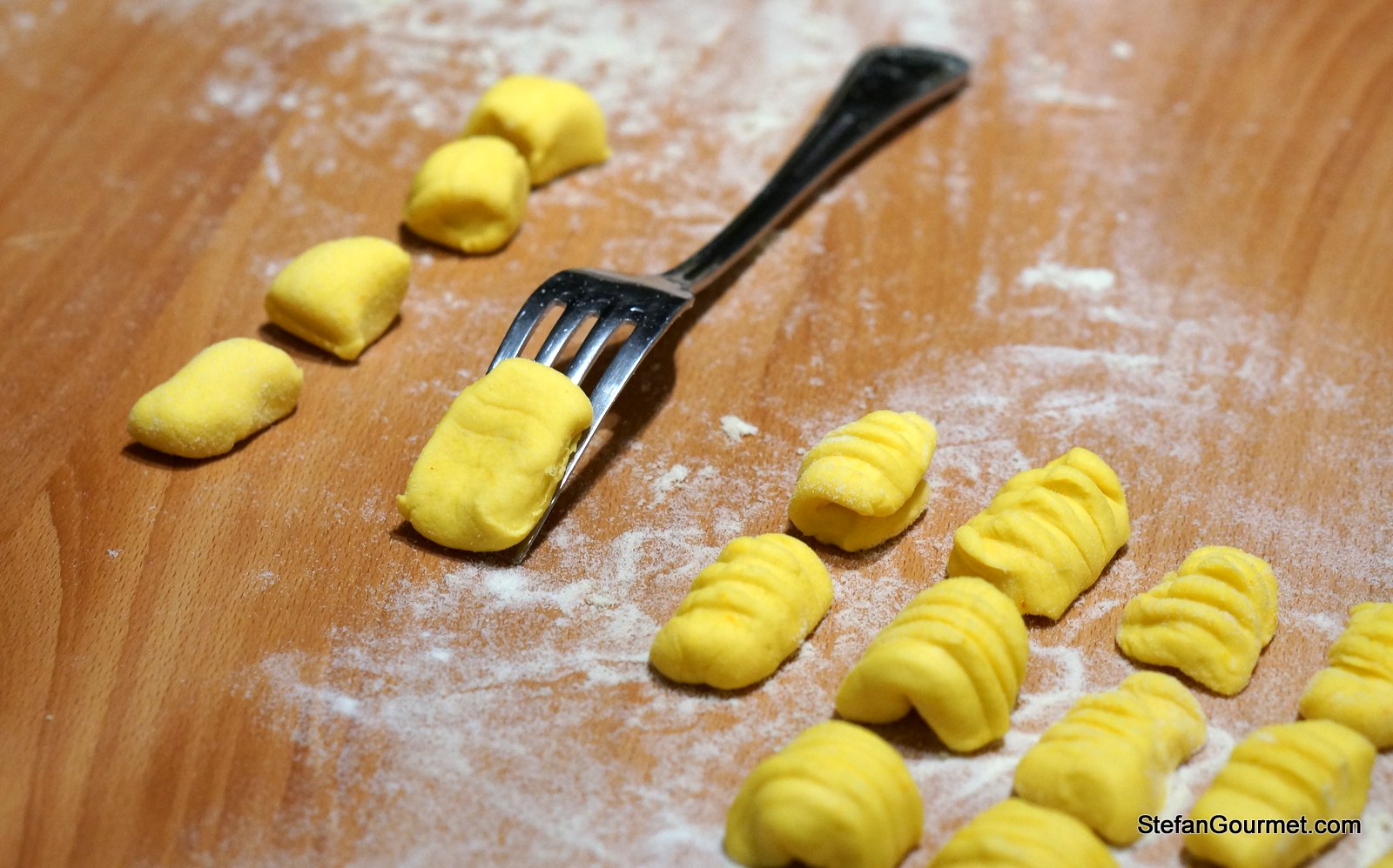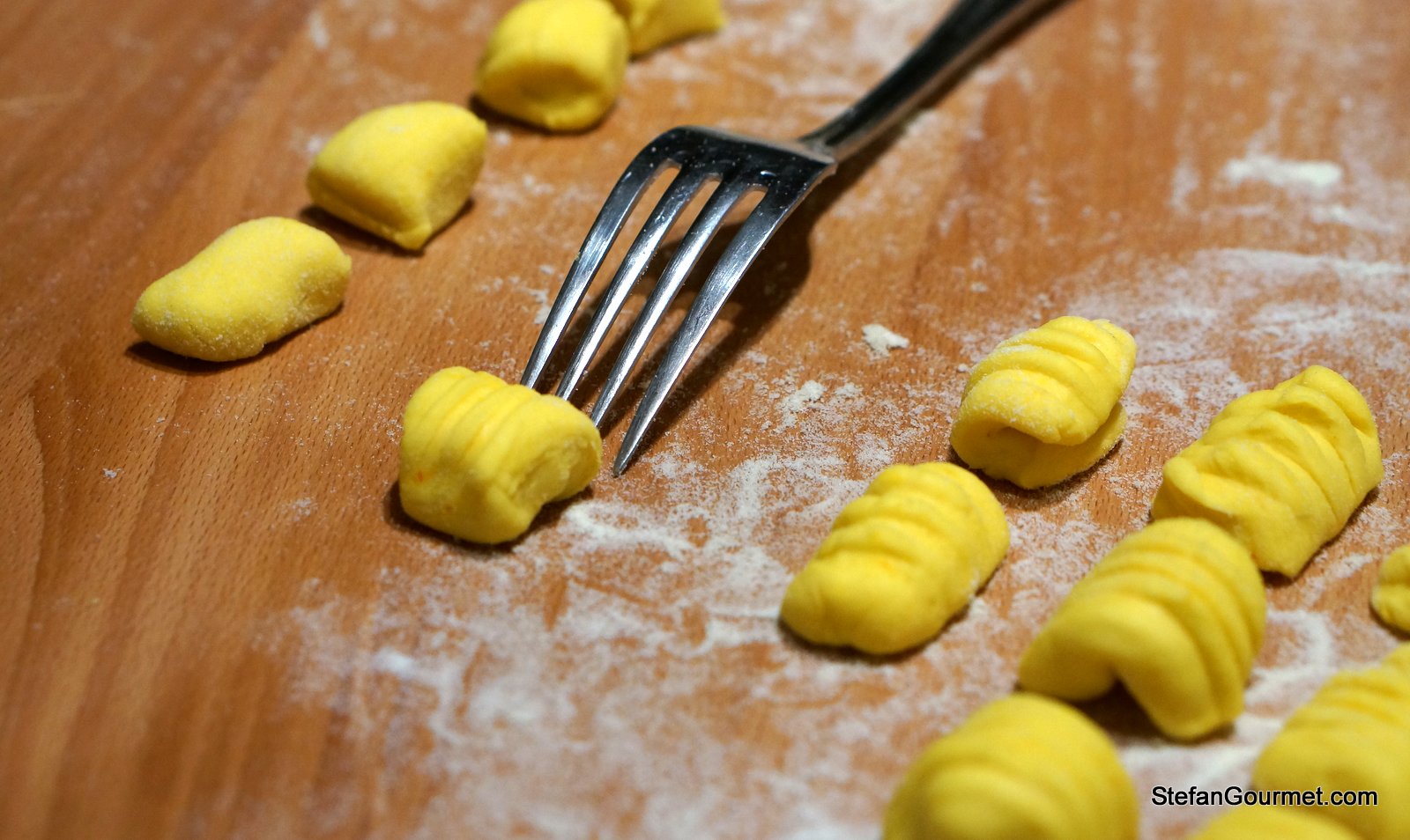 Press each piece of dough on a fork (or on a ribbed gnocchi instrument if you own one).