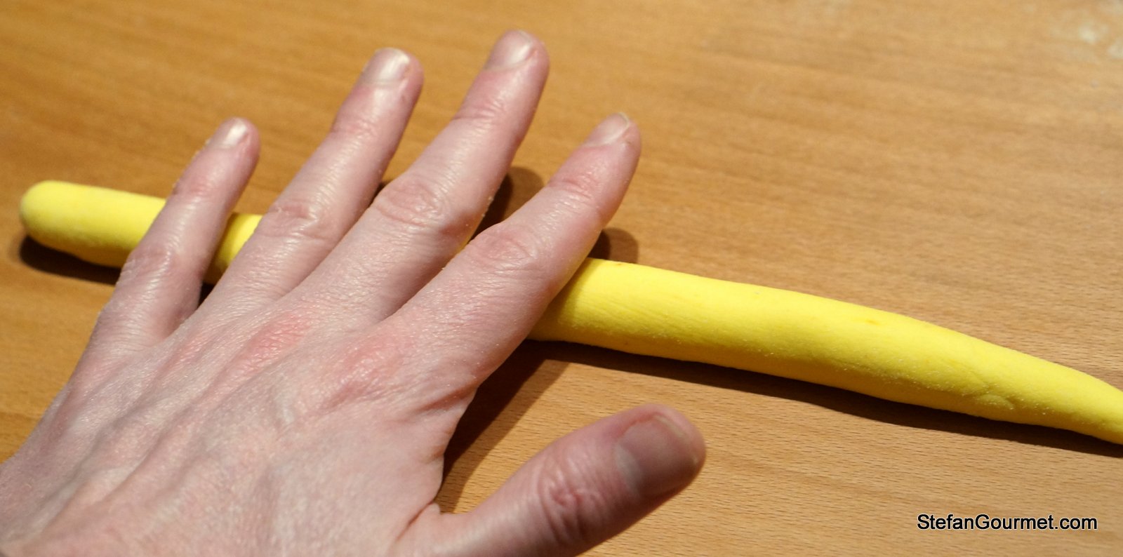 When the dough has rested, take a piece of the dough and on a wooden work surface roll it out with your hands to obtain a thin sausage (about 1 cm or 1/3 inch in diameter).