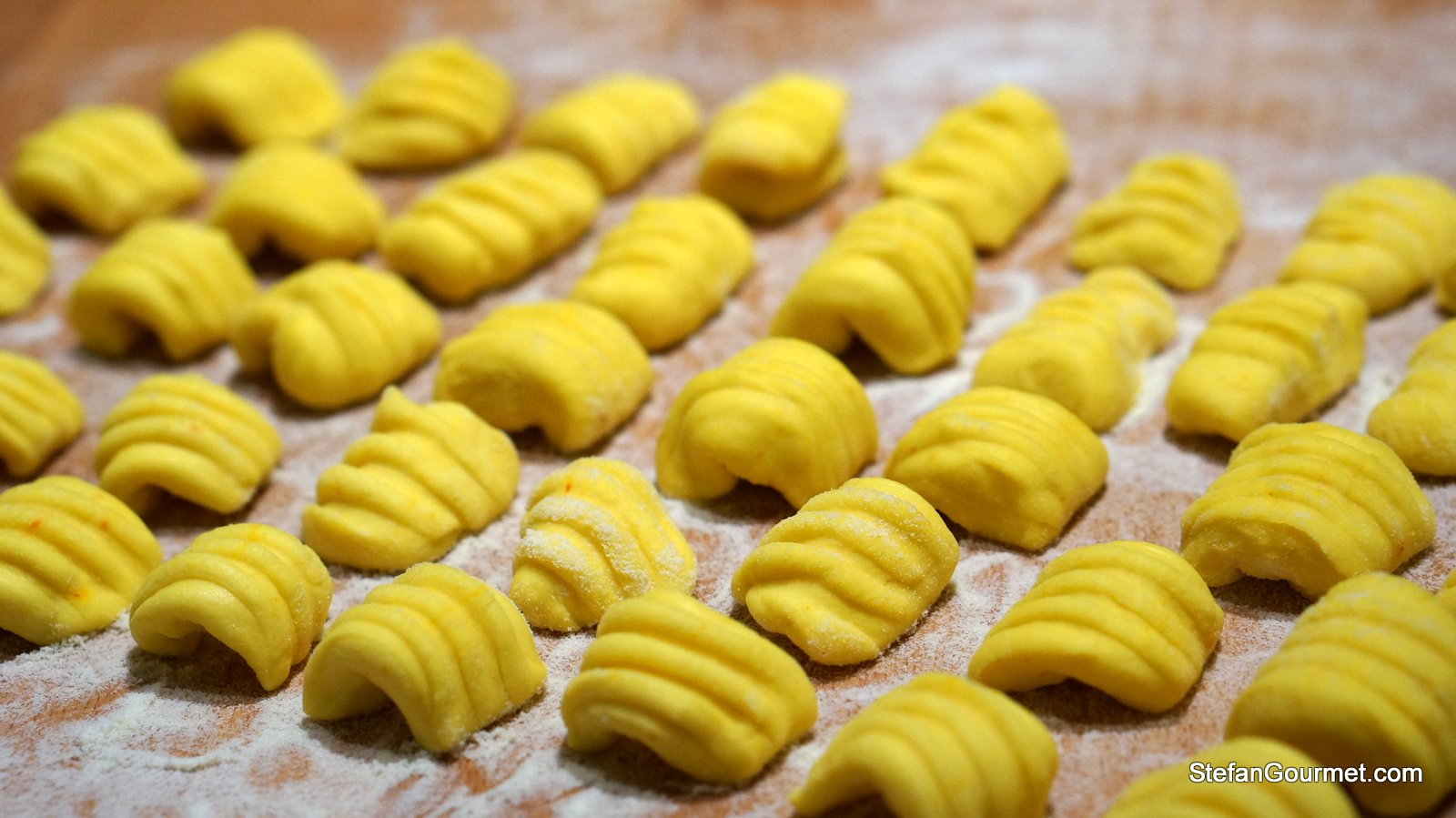 Allow the malloreddus to dry for about an hour on a floured work surface.