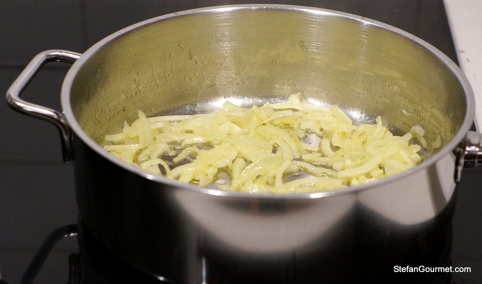 Heat the olive oil in a frying pan and add the onion. Cook over medium low heat for about 5 minutes or until the onion is soft and fragrant.
