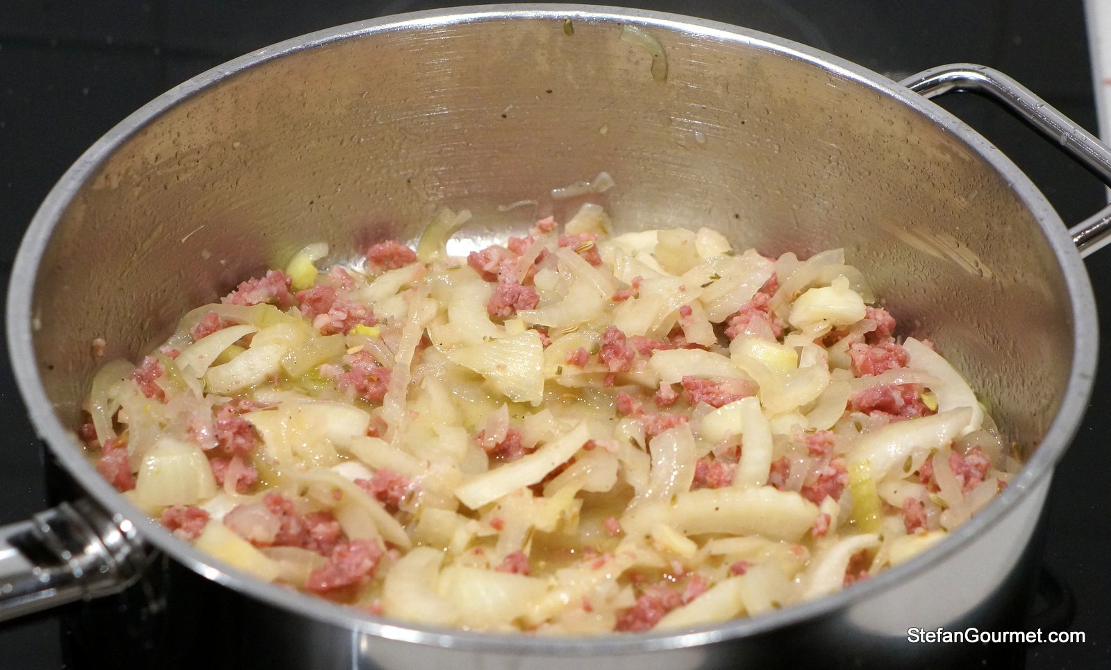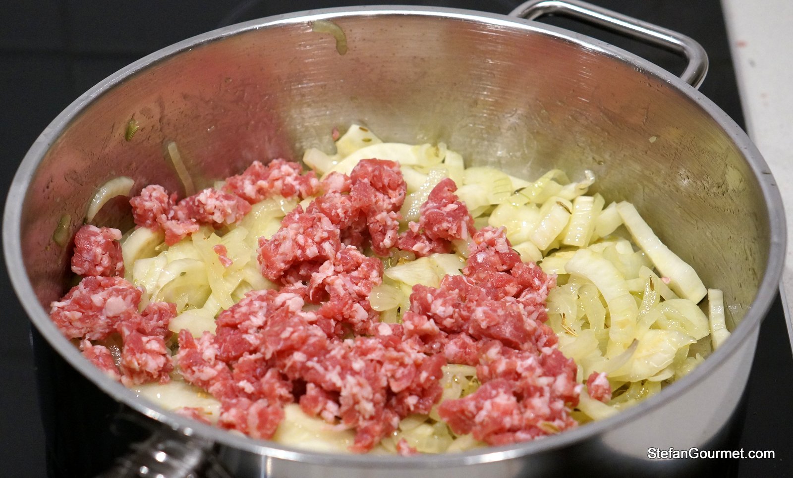 Now add the sausage meat and continue to sauté until the meat has lost its raw color.