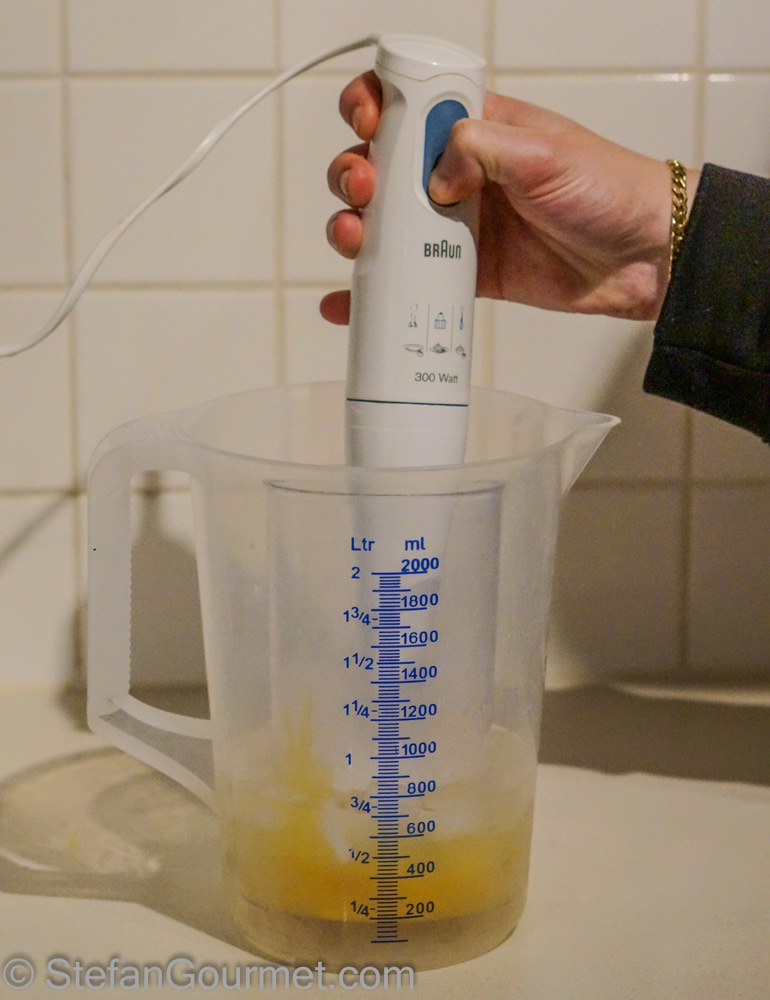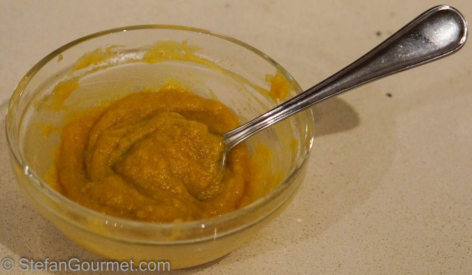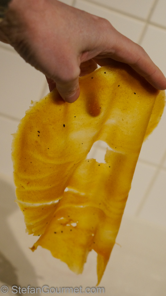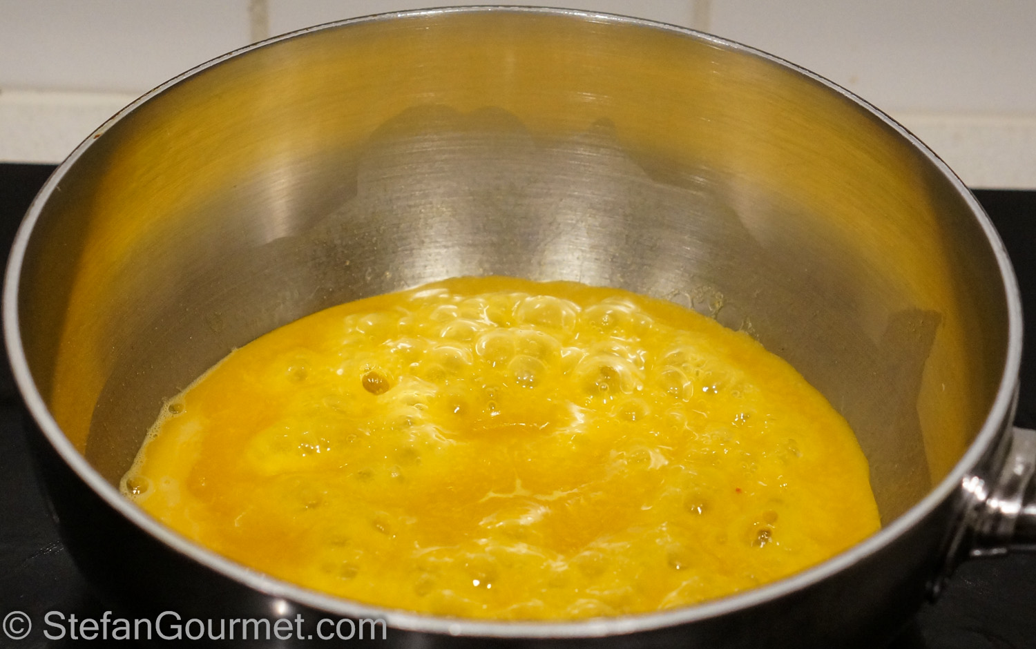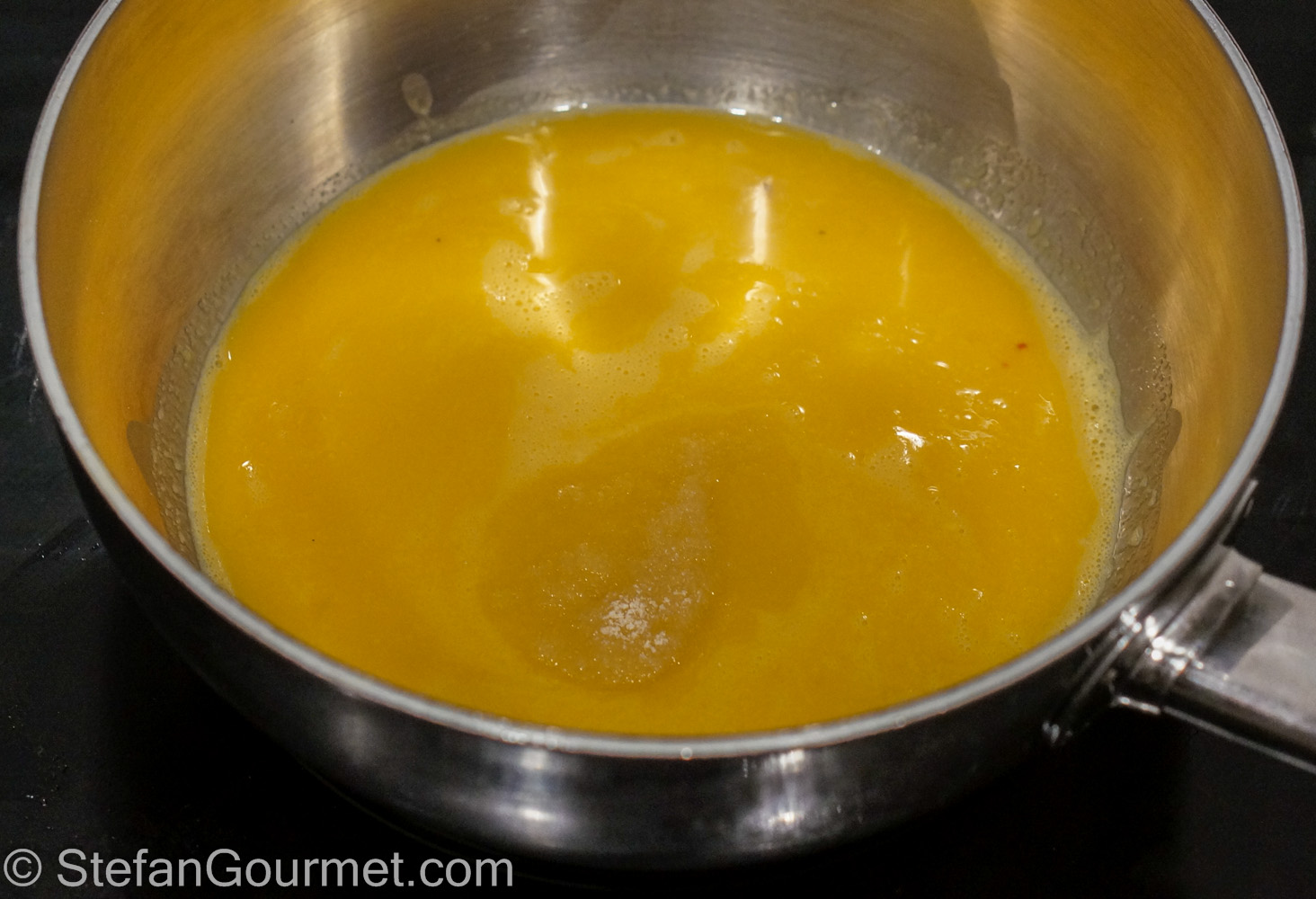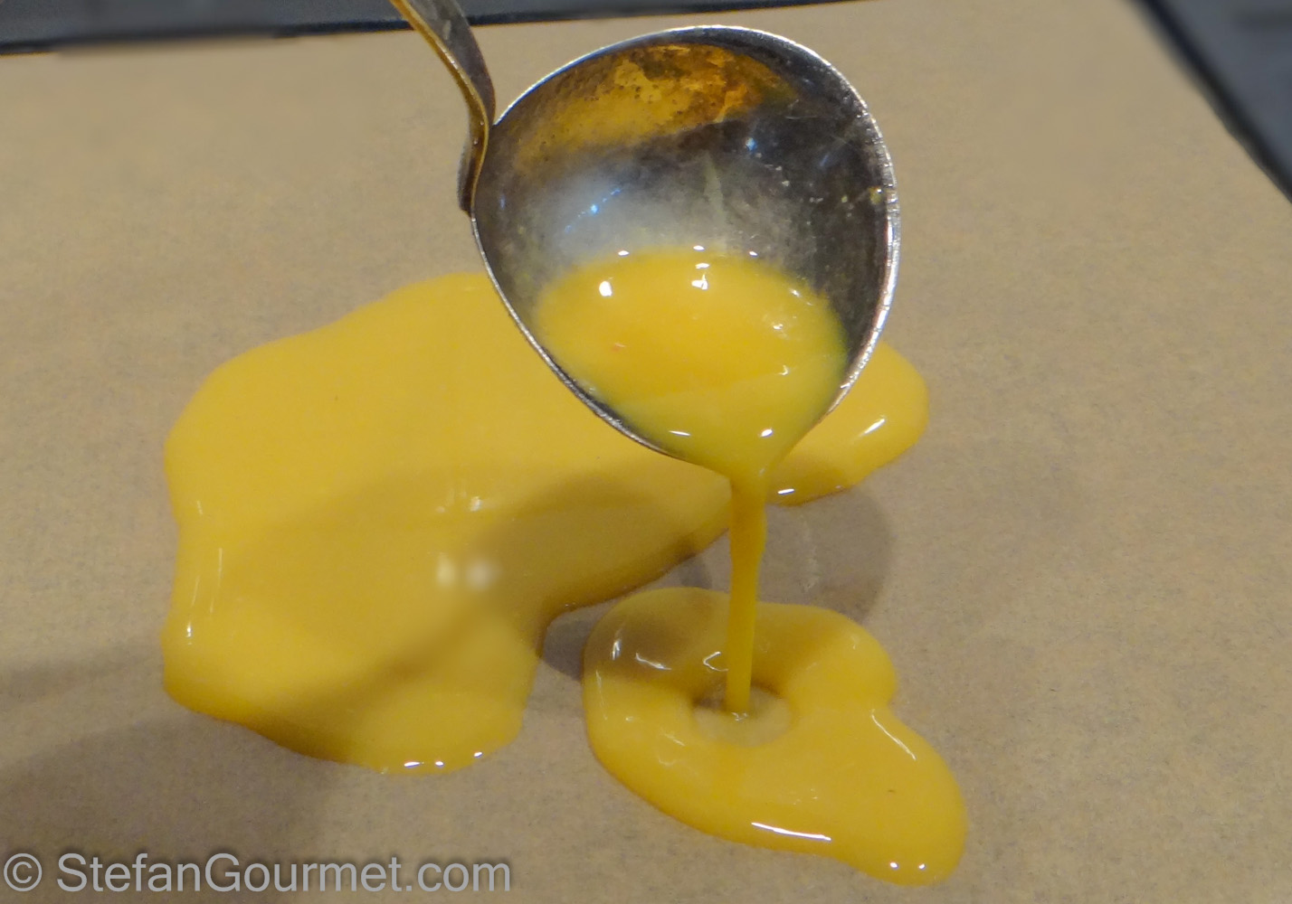 Combine the fluid gel with the horseradish, 50 grams brown butter, 4.5 grams malic acid, and salt to taste. We used less malic acid, as 4.5 grams is a lot. I think it does not make sense to provide such precise amounts of ingredients when you use a natural ingredient that is not standardized like passion fruit juice. Our passion fruit was not very ripe and quite acidic, so we used less malic acid.