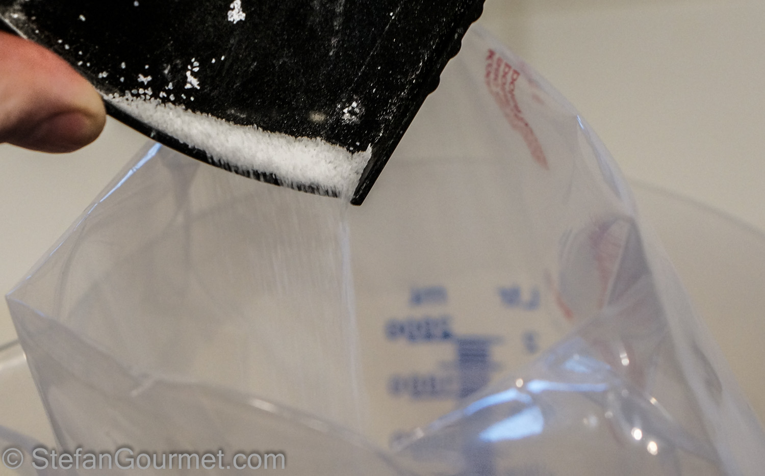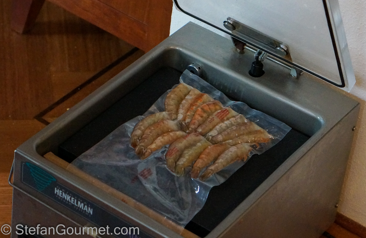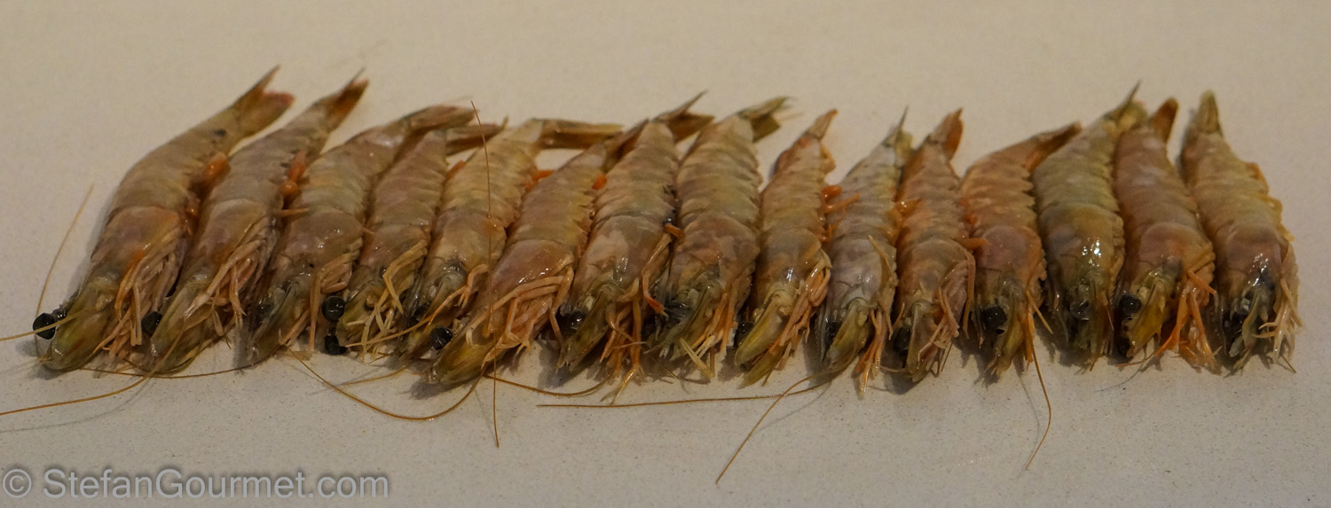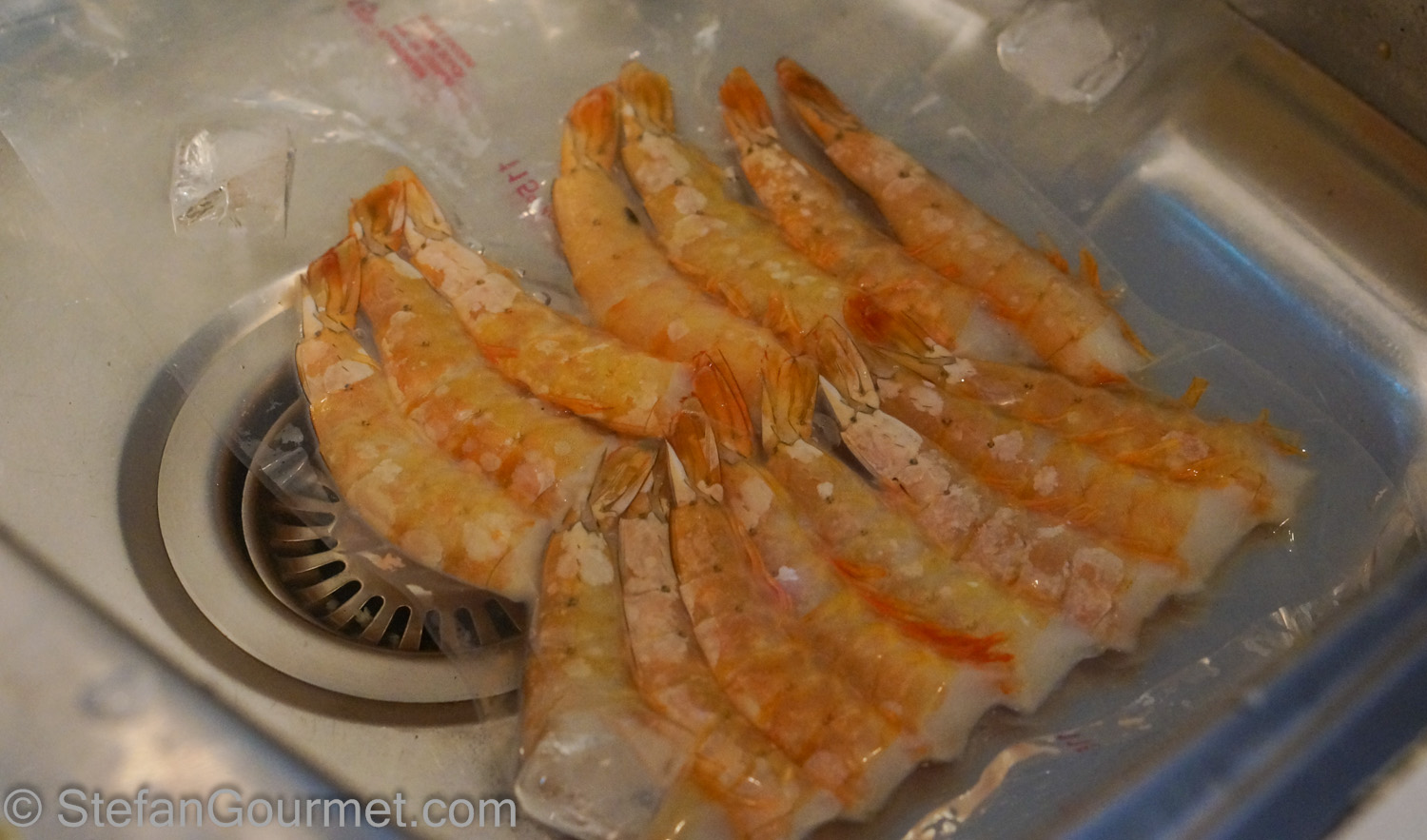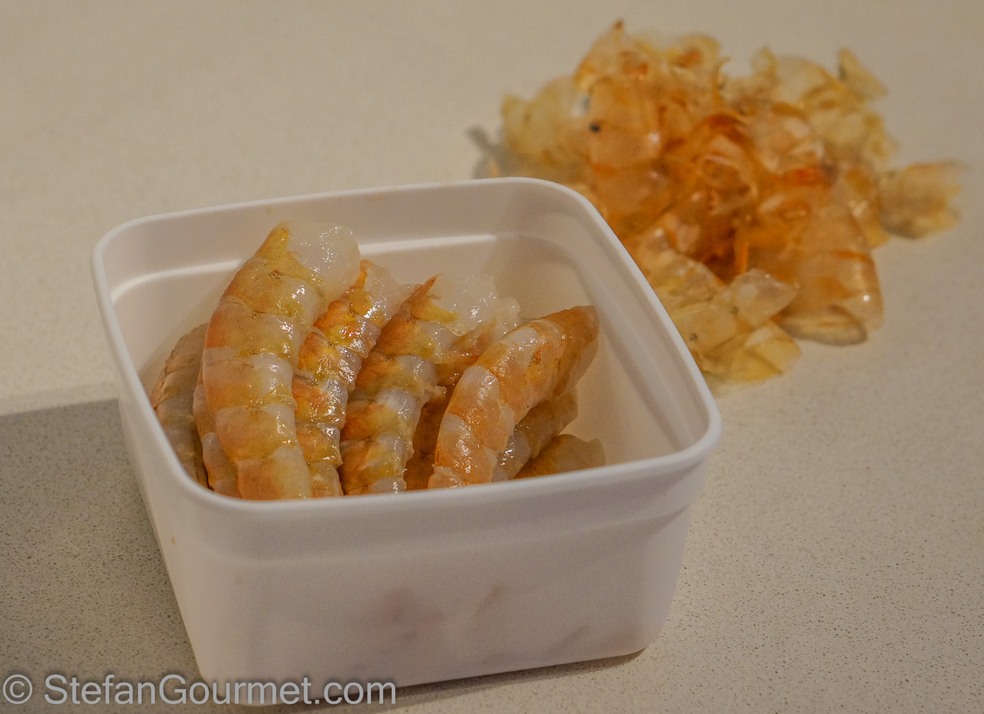 The Modernist Cuisine recipe uses “Live spot prawns”. Those are not available around here, so I’ve used 450 grams (1 lb) of medium shrimp (30-35 to a kilogram/15 to a pound).
