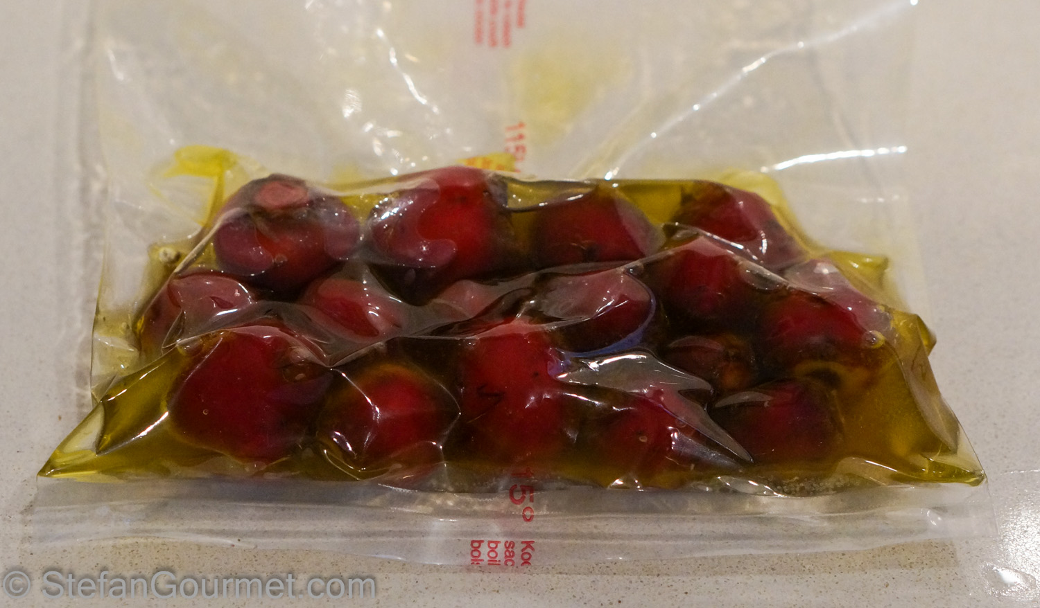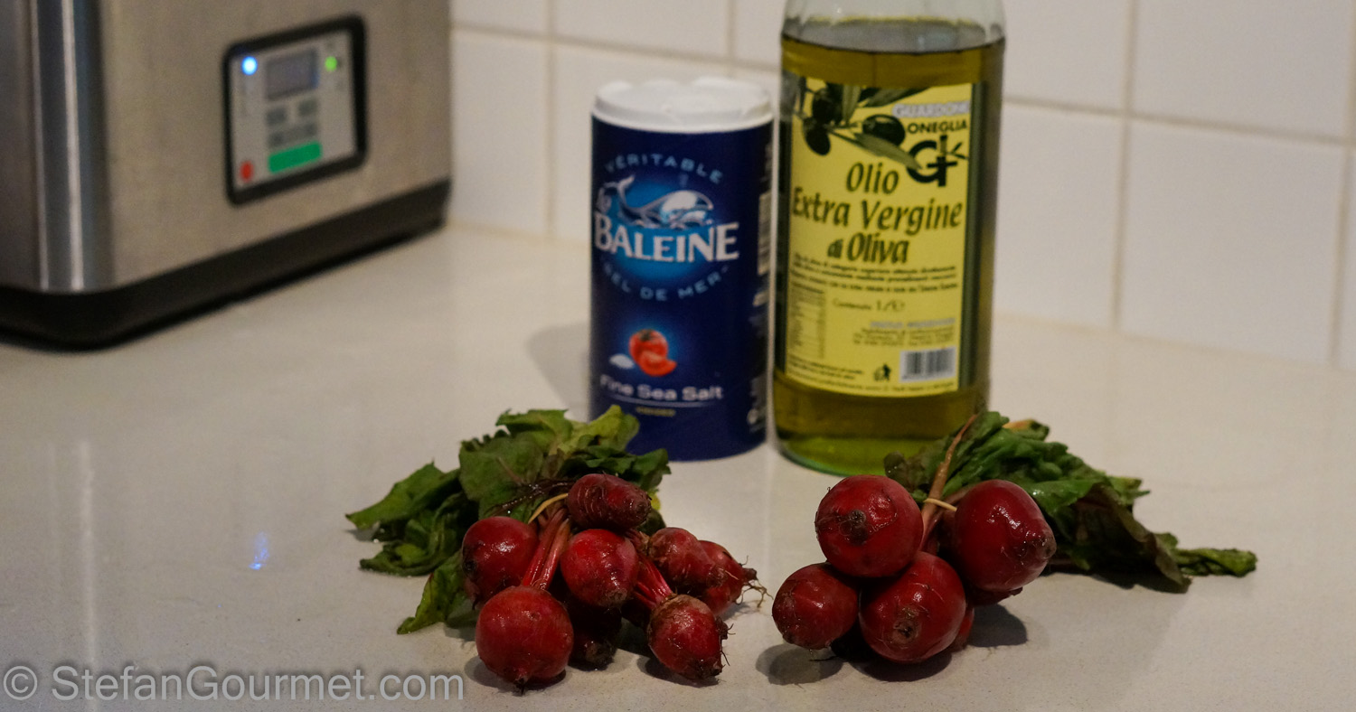 Ingredients: 250 grams of baby beets, trimmed but not peeled, 75 grams extra virgin olive oil, 3.5 grams of salt, and 50 grams of water.